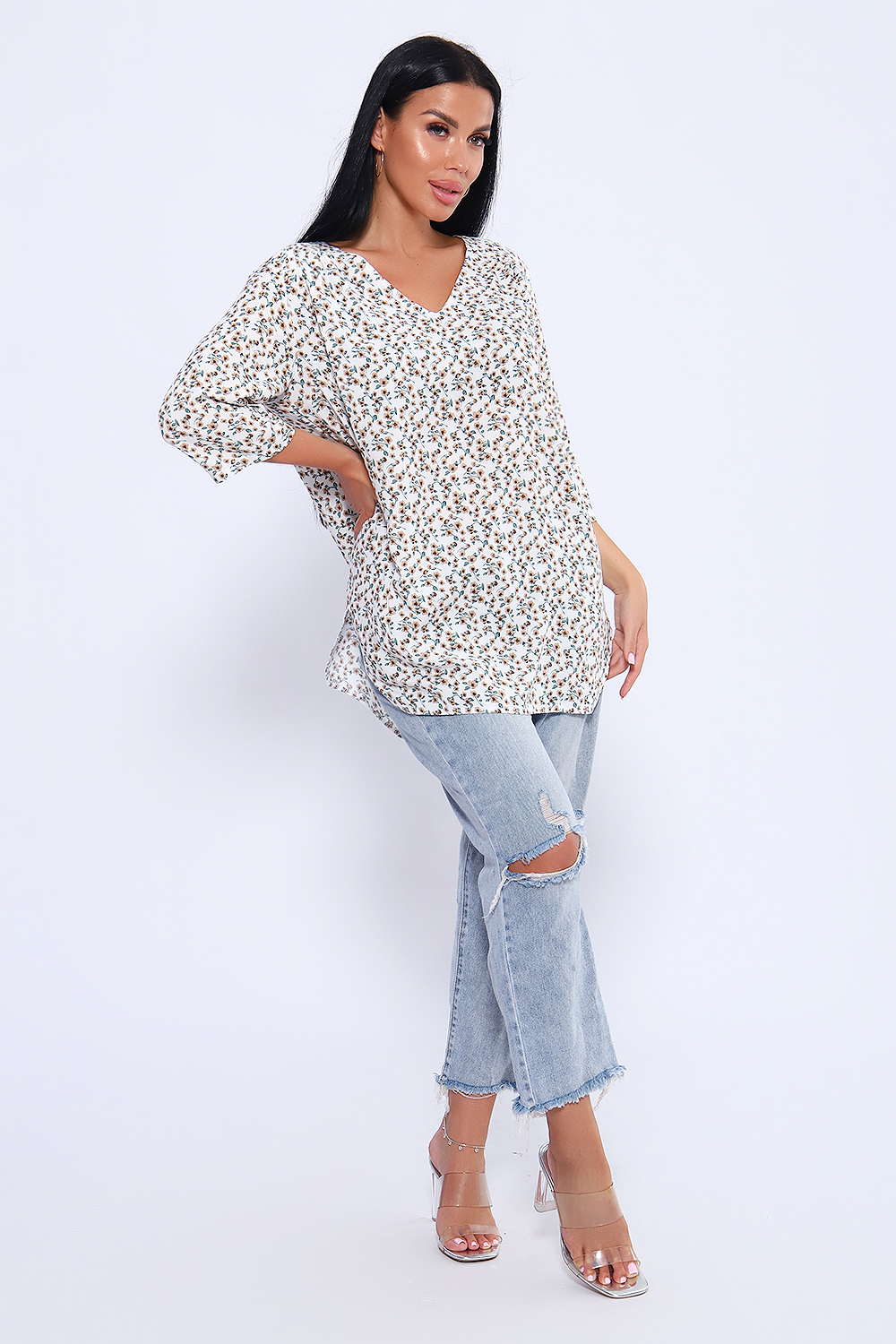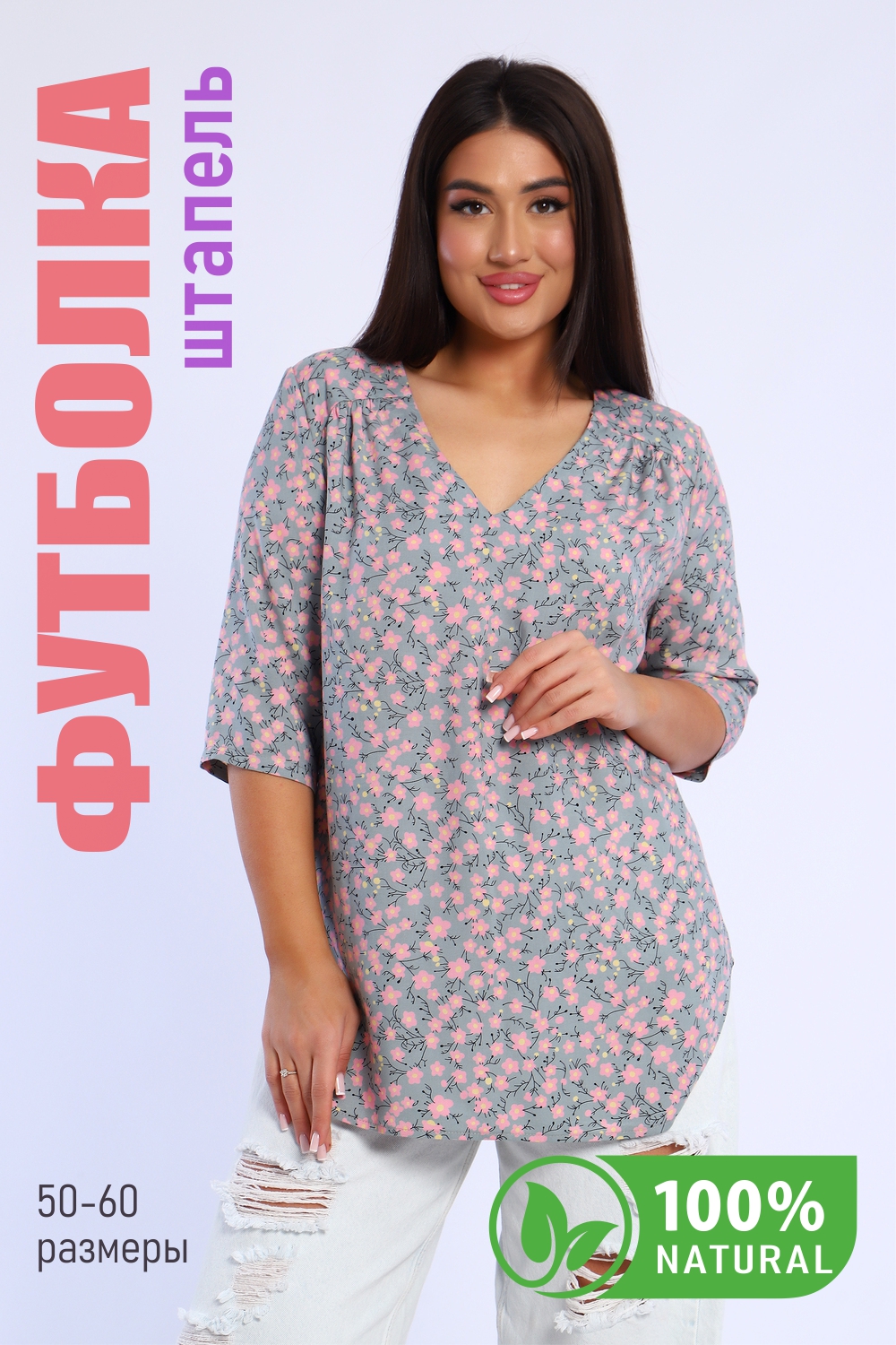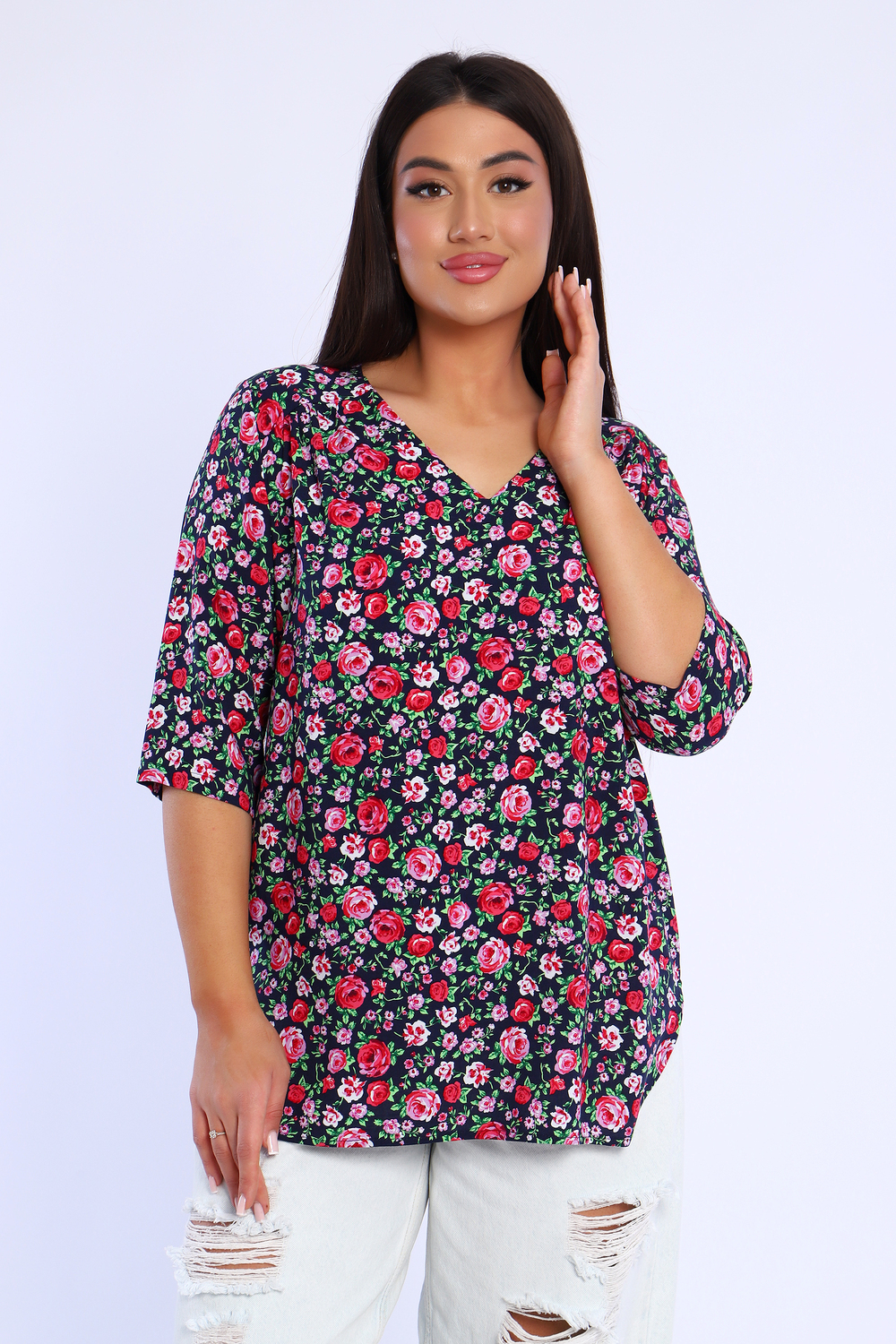 Удобная и просторная футболка с втачным рукавом 3/4. Ткань штапель делает ее очень приятной и комфортной в носке. Двойная кокетка на спинке, переходящая на полочку. Сборка по линии кокетки и складка на спинке добавляют объем изделию. Горловина с V-образным вырезом. Низ футболки фигурный, длина ниже линии бедра.