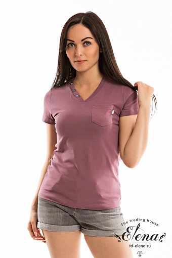 Футболка выполнена из полотна кулирка с лайкрой. Силуэт приталенный, короткий рукав. Слева настрочен небольшой карман с декоративным флажком. На планке V-образного выреза горловины
