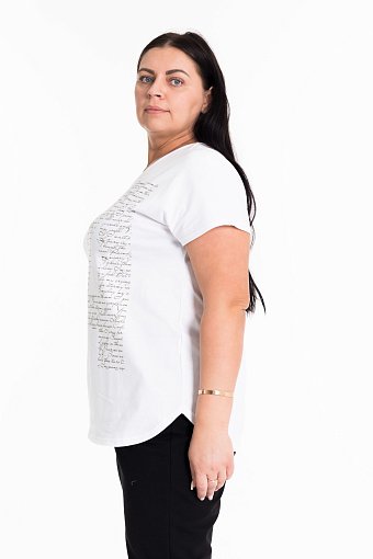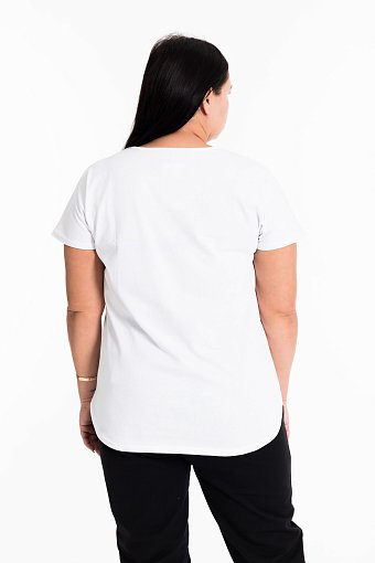 Футболка из однотонной кулирки со спущенной линией плеча. Горловина имеет V-образный вырез, низ закруглен спереди и на спинке. Спереди нанесён принт.