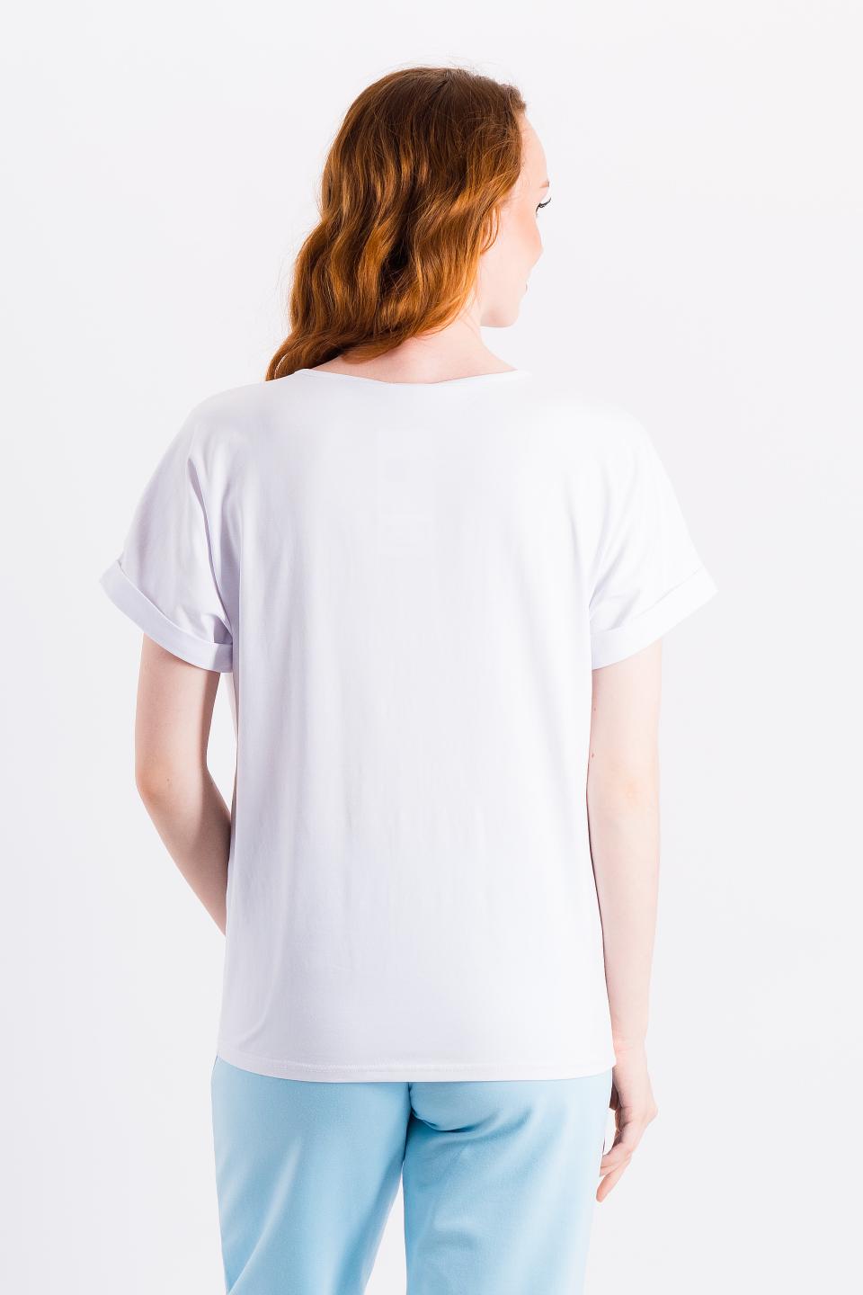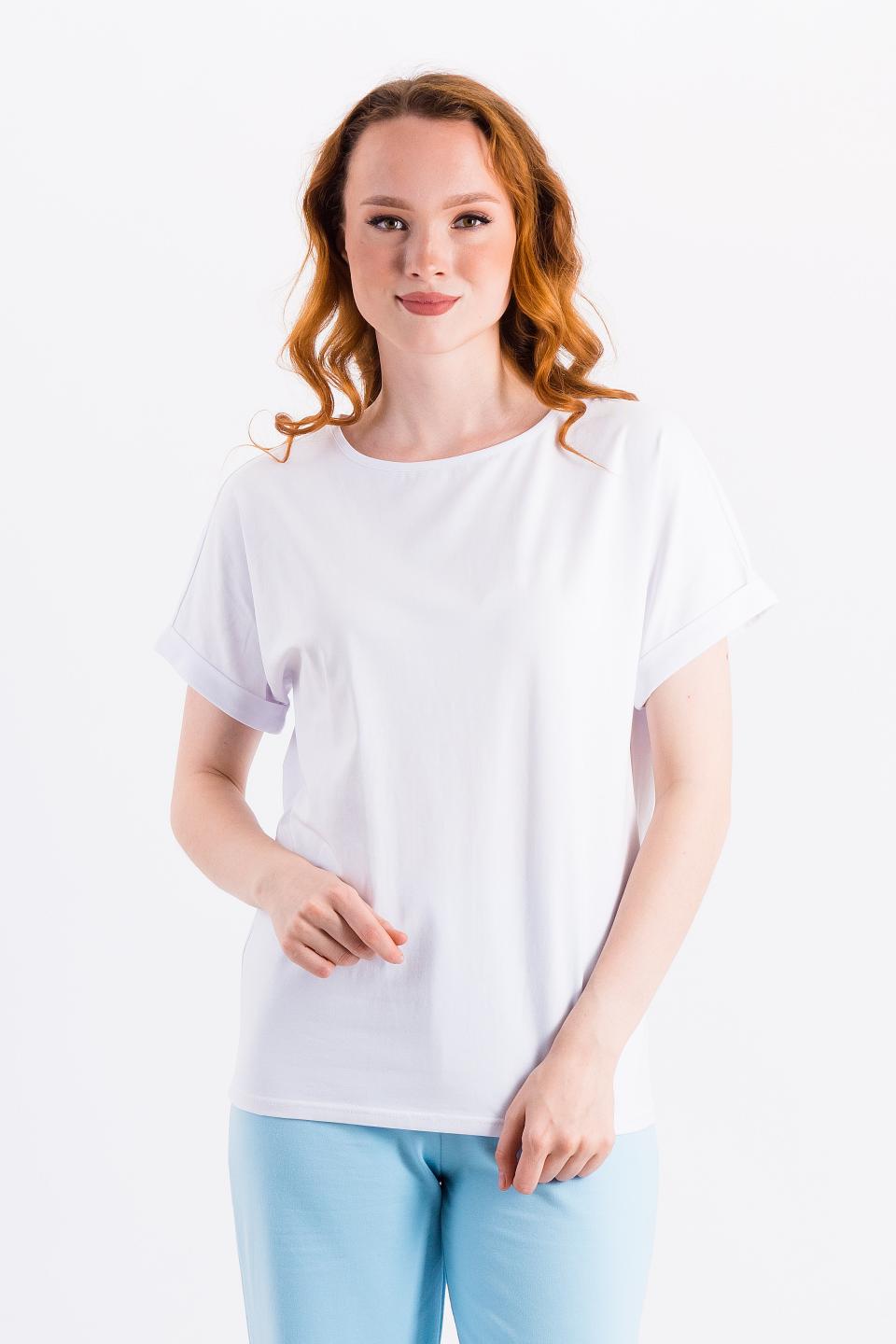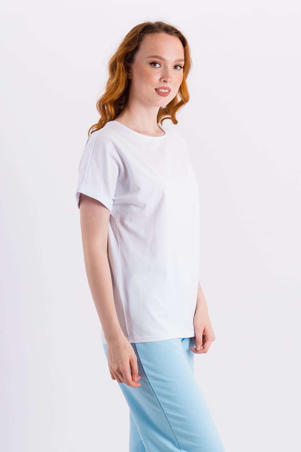 Описание: Комфортная футболка со спущенным плечом и манжетами с отворотом. Идеальный вариант для фигур верхнего типа.