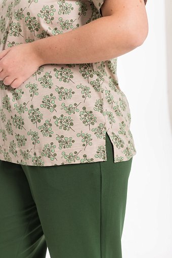 Женский костюм, сочетающий комфорт и стиль, идеально подойдёт для дома и отдыха. Брюки выполнены из однотонного футера двухнитки, имеют притачной пояс на резинке и удобные боковые карманы. Футболка изготовлена из кулирки фламли с набивным рисунком, оснащена коротким рукавом и круглым вырезом горловины. Мягкие и приятные к телу материалы обеспечивают комфорт в носке, а современный дизайн делает костюм универсальным выбором на каждый день.