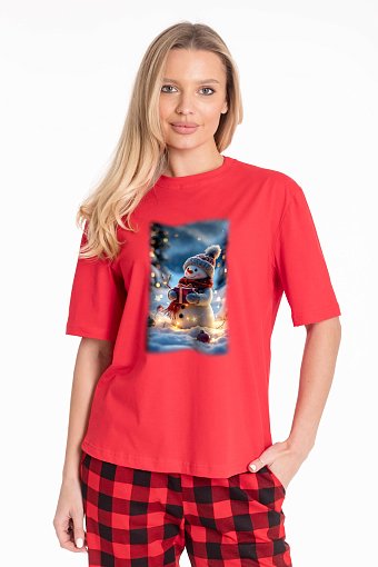 Футболка с новогодним принтом выполнена из хлопкового полотна. Материал приятен к телу, создает комфорт и хорошую воздухопроницаемость. Классический крой с коротким рукавом и круглым вырезом горловины обеспечивает удобную посадку и свободу движений. Отличный выбор для создания праздничного настроения и комфортных повседневных образов.