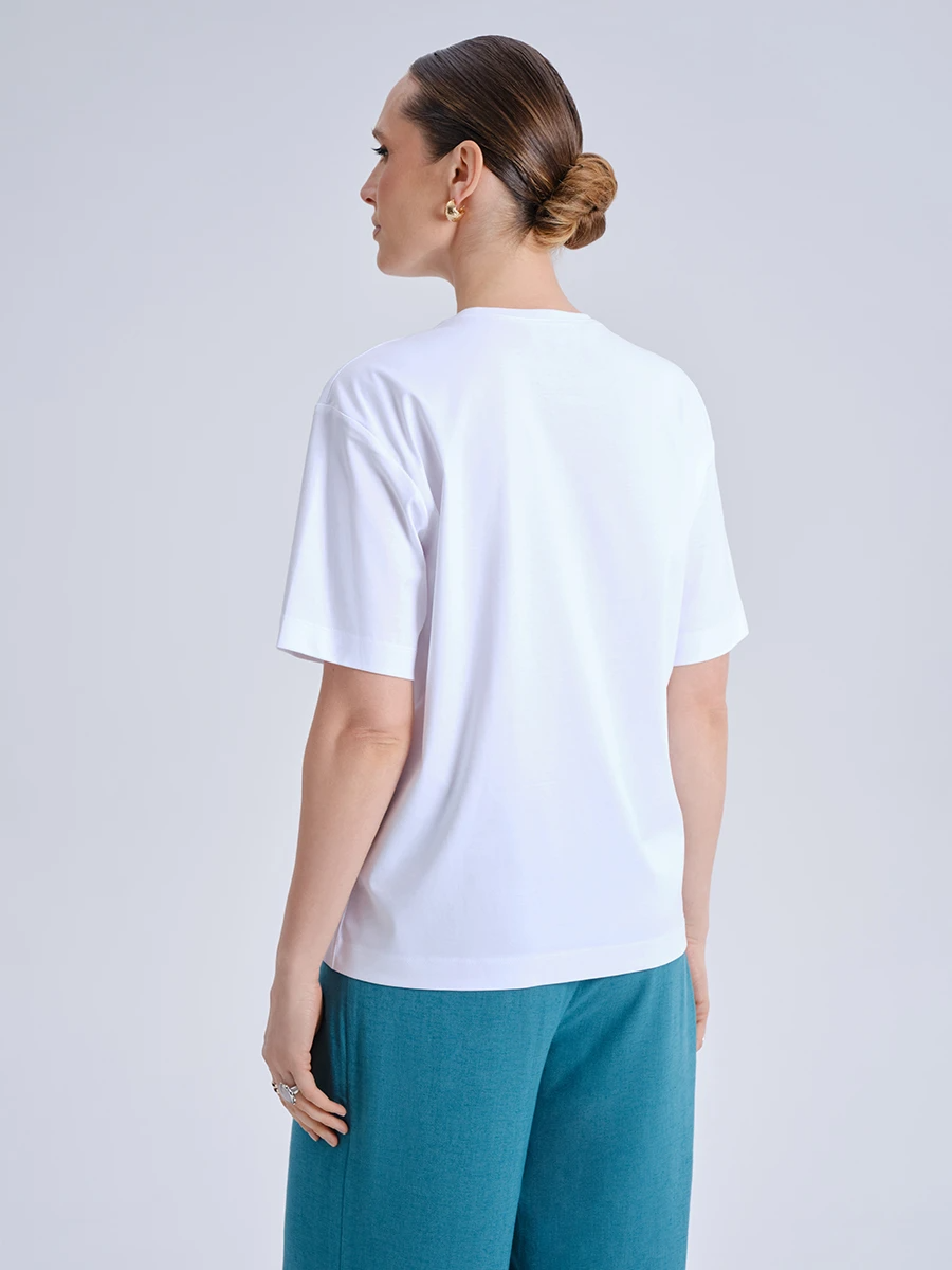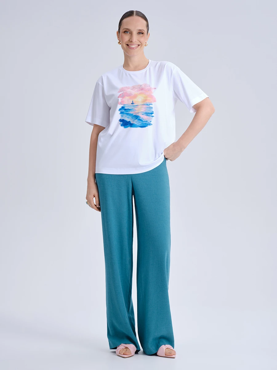 Женская футболка из мерсеризованного хлопка — базовая модель с изюминкой, подходящая как для повседневных, так и для расслабленных курортных образов. Прямой свободный крой обеспечивает комфорт и не сковывает движений, а классическая длина делает изделие универсальным для сочетания с брюками, джинсами и юбками. Белоснежная основа дополнена выразительным принтом в акварельной технике, изображающим морской пейзаж с закатом и парусником — такой акцент придаёт образу лёгкость, мечтательность и индивидуальность.¶¶Материал — 100% мерсеризованный хлопок — отличается шелковистым блеском, прочностью и высокой воздухопроницаемостью, обеспечивая приятные тактильные ощущения даже в жаркую погоду. Модель отлично сохраняет форму после стирки и долго выглядит как новая. Идеальный выбор для тех, кто ценит простоту с характером и натуральные материалы.
