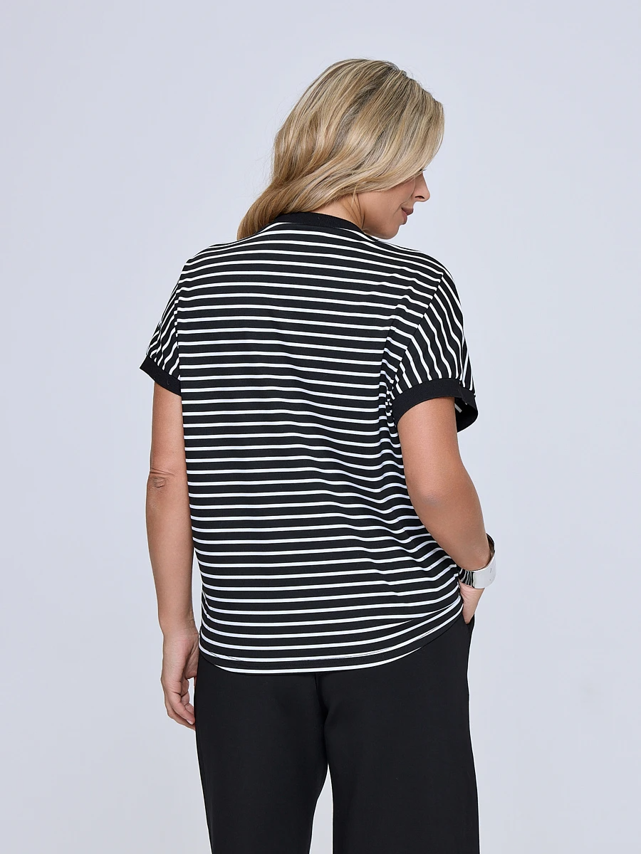 Женская футболка свободного кроя выполнена из мягкого трикотажа с высоким содержанием хлопка и добавлением вискозы. Горизонтальная черно-белая полоска придает образу легкость и свежесть, а контрастный принт создает игривое и расслабленное настроение. Прямой крой и слегка спущенная линия плеча создают аккуратный силуэт. Классический круглый вырез, короткие рукава обеспечивают комфорт и свободу движений.