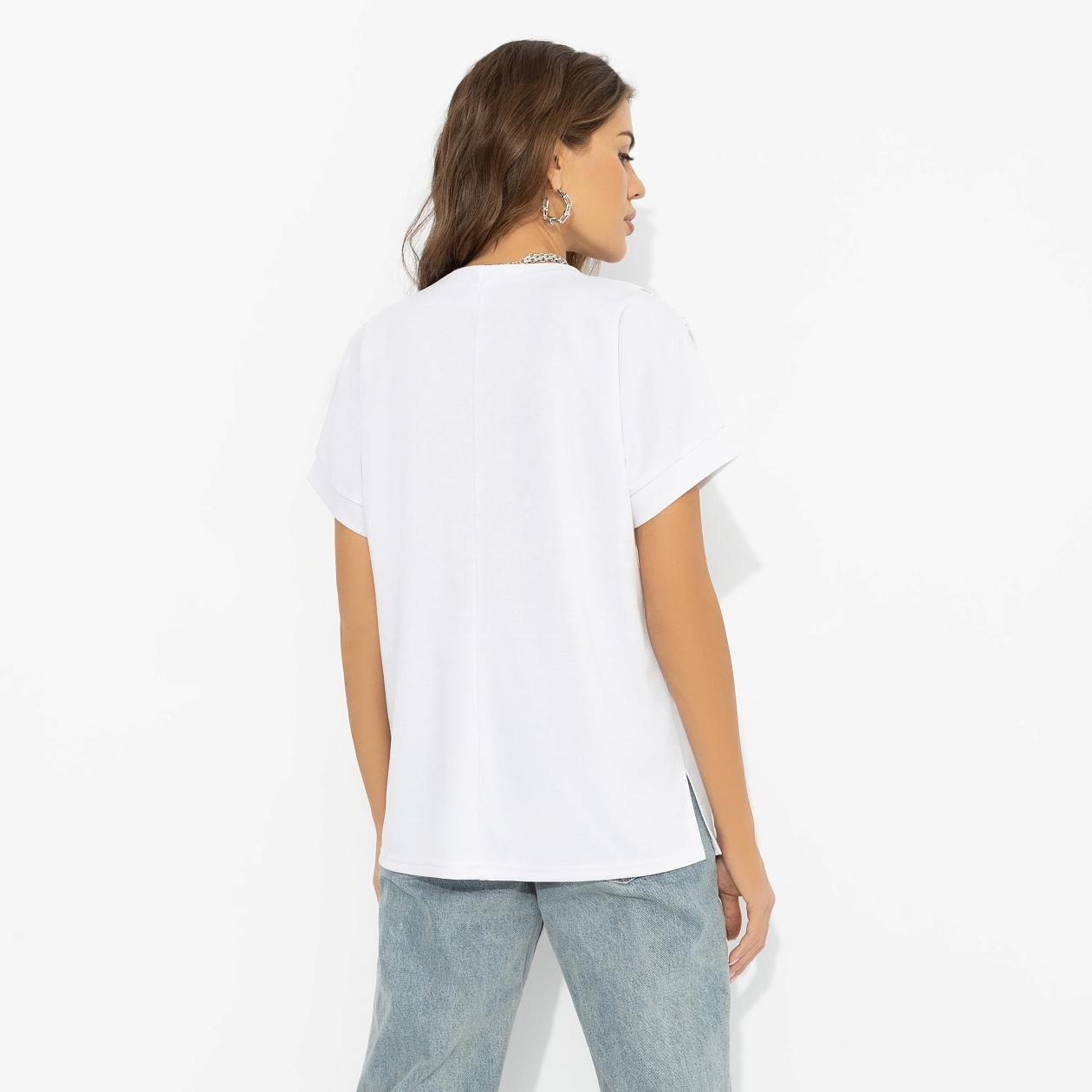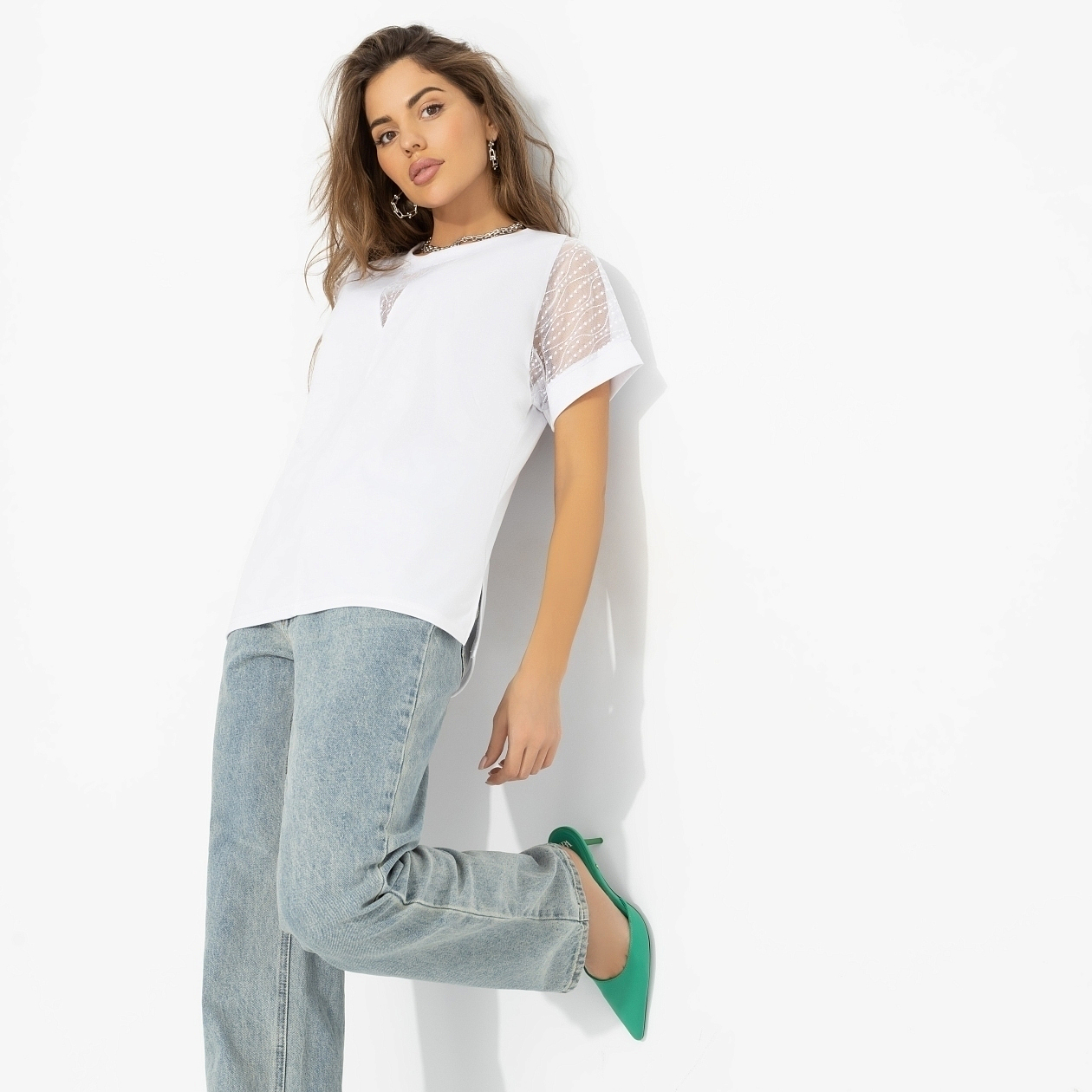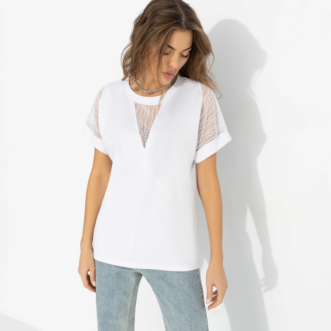 Ничто не расслабляет так, как окончательно принятое решение. В этот момент стиль перестаёт быть задачей и превращается в естественное продолжение тебя. С футболкой ЧАРУТТИ так и будет. Лаконичный силуэт этой модели строится на игре фактур: гладкая база основной ткани уравновешивает деликатную прозрачность гипюра. Контраст делает образ нарядным без усилий и легко адаптируется под любой ритм дня. Элегантность, которая приходит вместе с внутренним спокойствием.