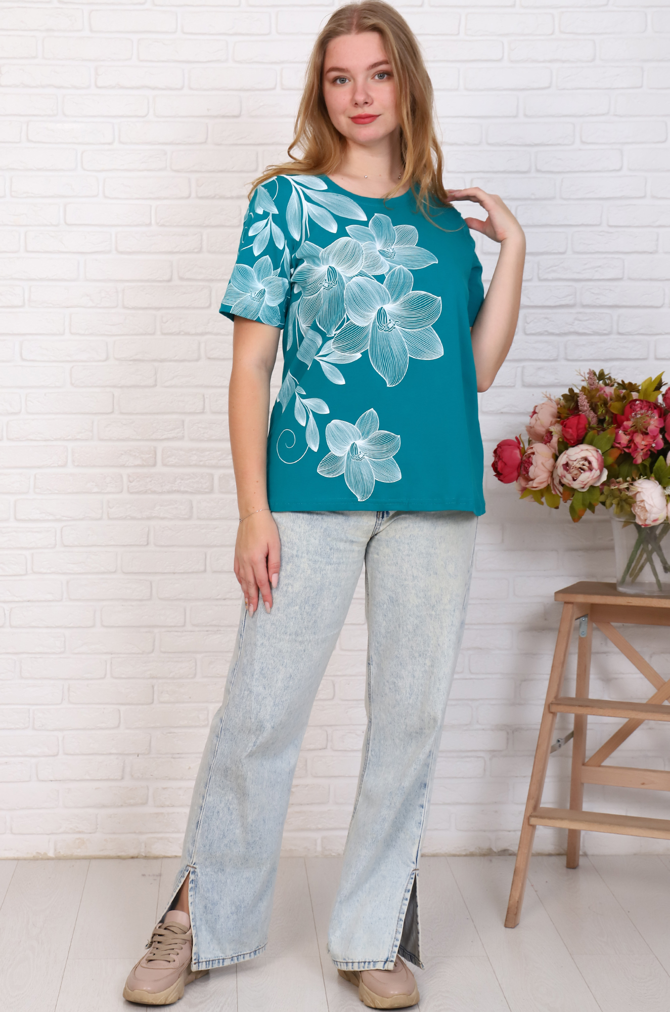 Хлопковая футболка с цветочным печатным принтом придаёт женственности и романтичности. Модель классического прямого кроя.