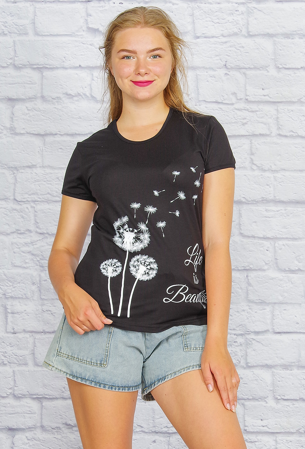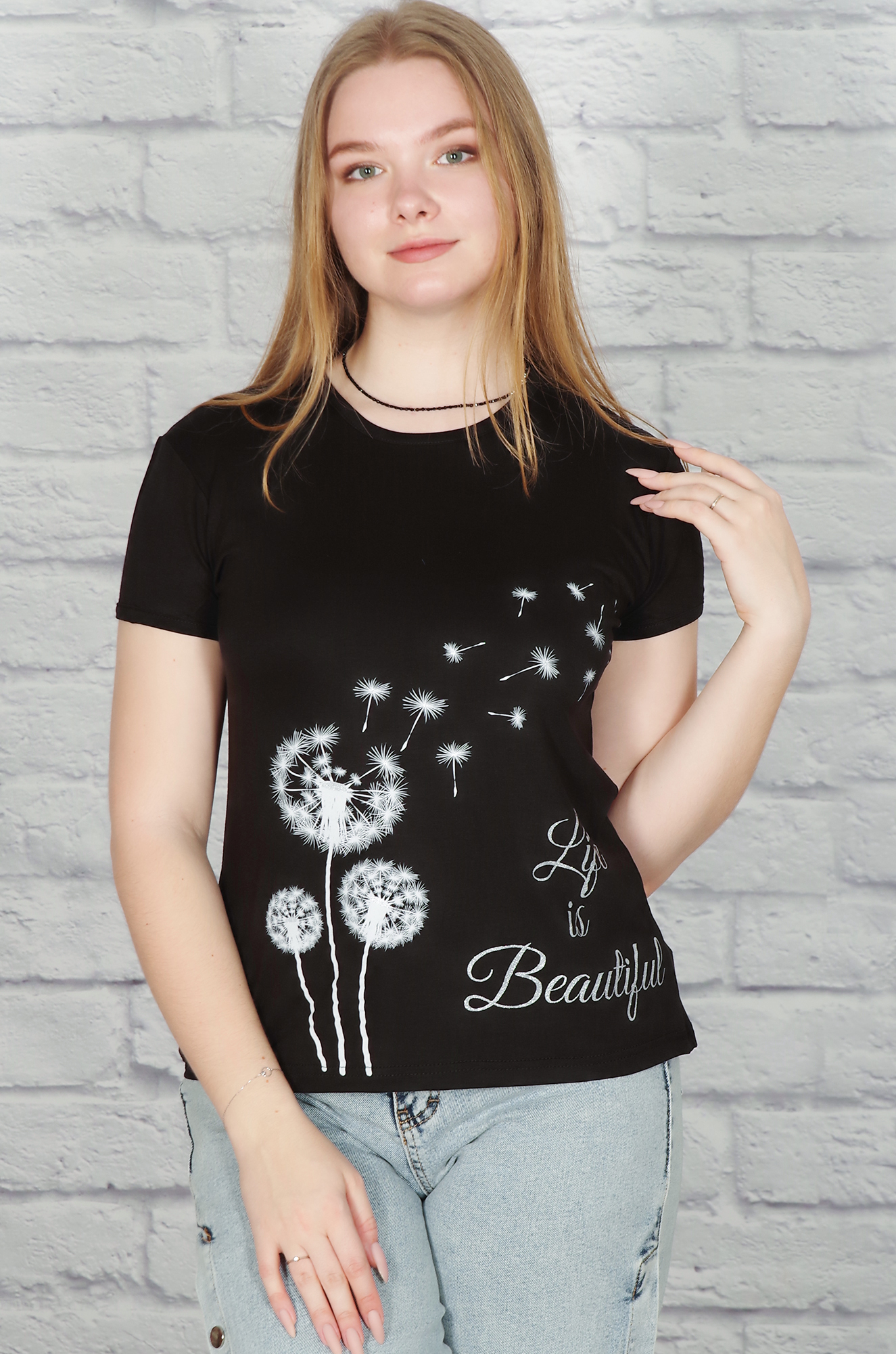 Обворожительно, грациозно и очень женственно смотрится футболка с изящным принтом "одуванчики".