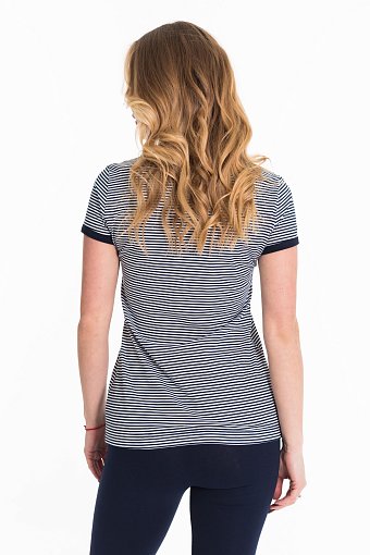 Футболка выполнена из кулирного полотна с набивкой в полоску. Рукав короткий, горловина имеет круглый вырез с имитацией планки с застежкой на пуговицы. В качестве отделки рукава и горловина изделия обработаны бейкой контрастного цвета. Спереди на футболке расположен принт.