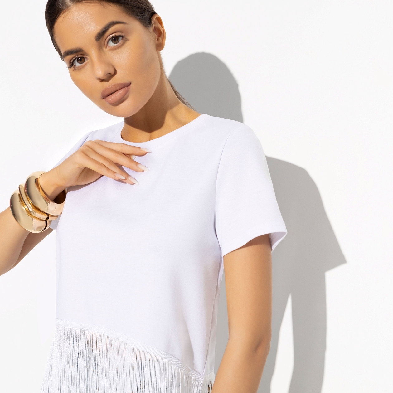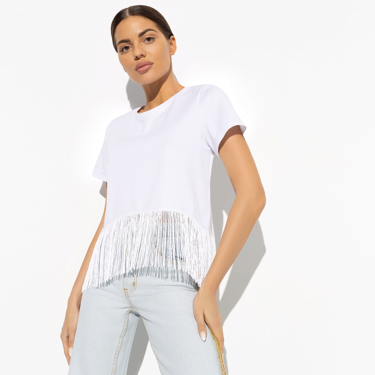 Утром была йога в парке, потом ланч с подругами и вечером вечеринка под открытым небом. Такие выходные мы любим. Если тебе кажется, что невозможно в этот день не менять образ, значит, просто у тебя нет футболки с трендовой бахромой. Футболка в белом цвете. В составе ткани вискоза. Подол футболки оформлен бахромой в тон ткани по всей окружности изделия.