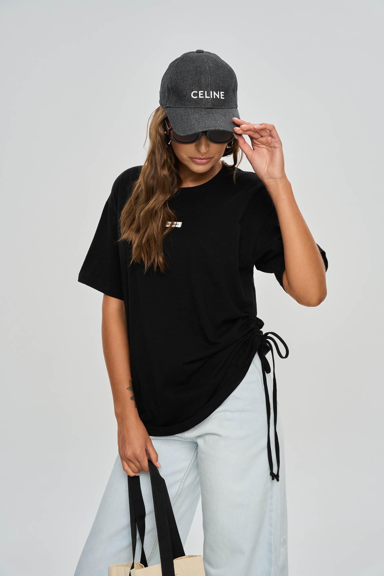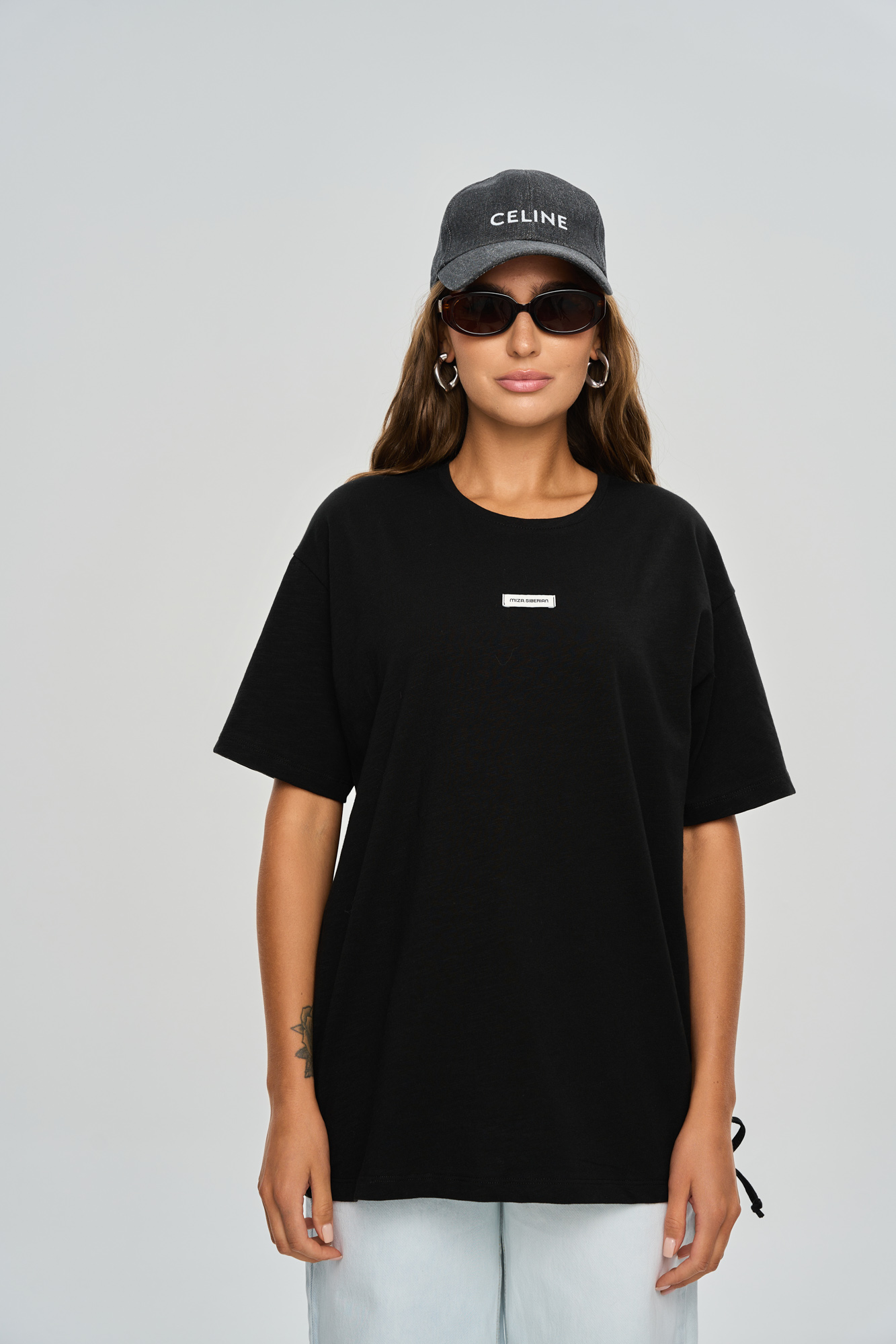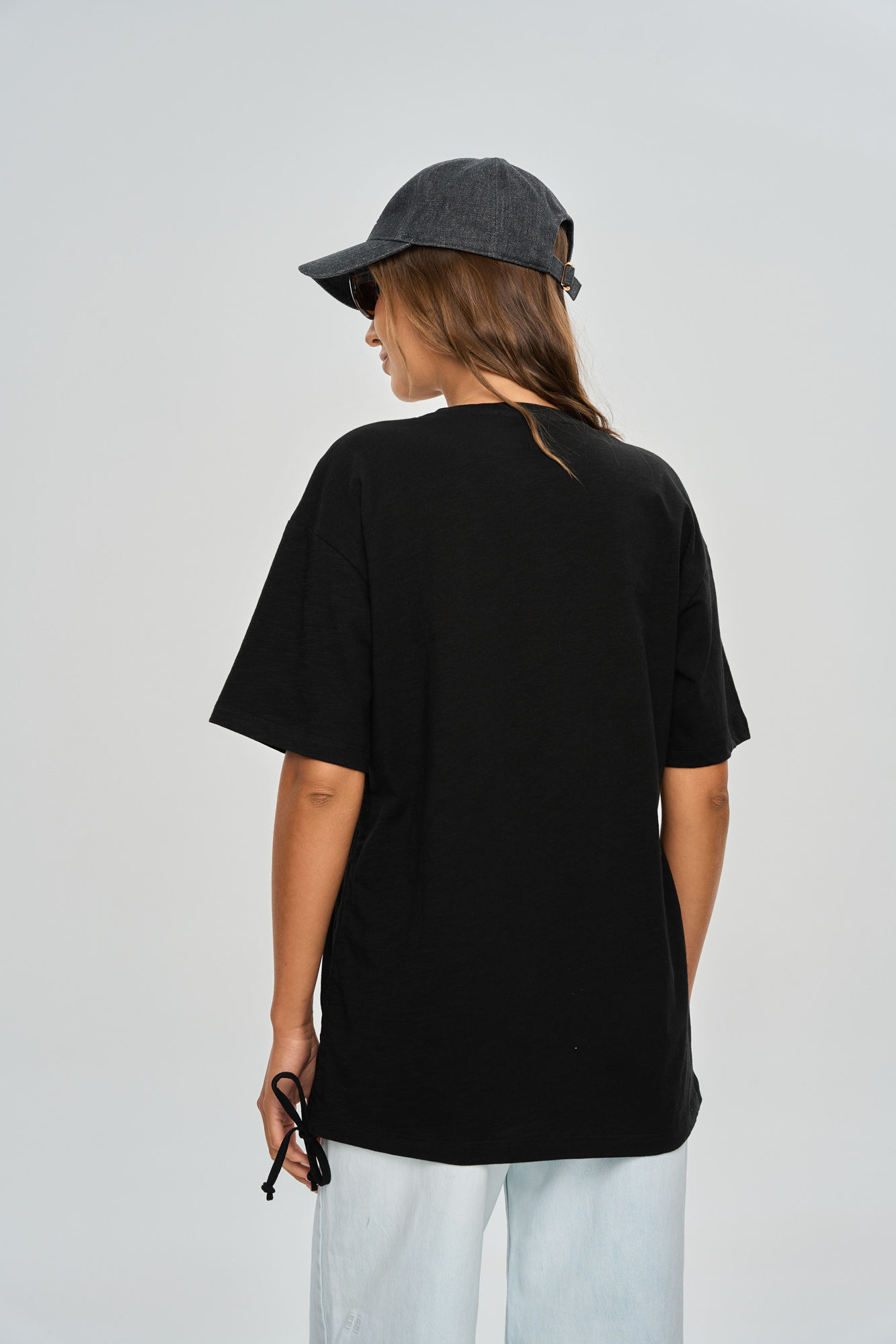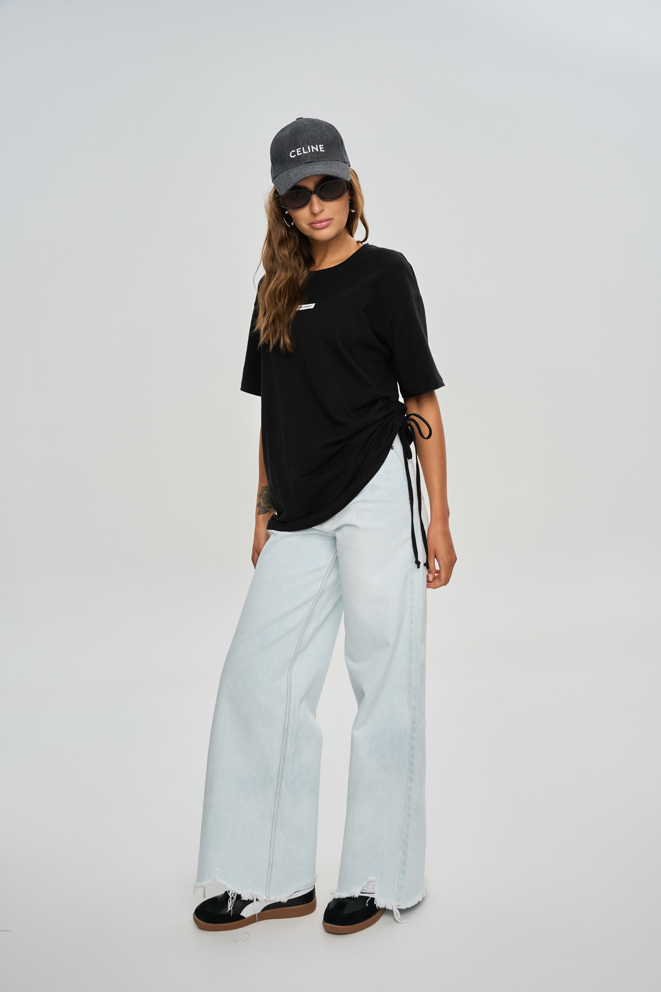Футболка прямого кроя свободного силуэта, немного удлиненная.