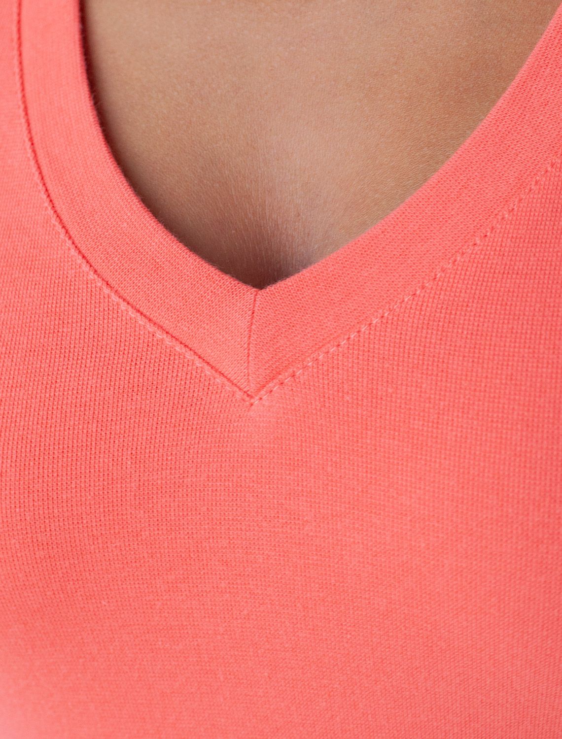 Облегающая футболка с V-образным вырезом в цвете "розовый коралл" создаст утонченный образ. Идеальная базовая модель для вашего гардероба! Глубокий V-образный вырез подчеркивает линию шеи и зрительно удлиняет силуэт. Футболка выполнена из хлопка с добавлением эластана, которая мягко облегает контуры тела, подчеркивая достоинства фигуры. Универсальный вариант для создания стильных повседневных образов.