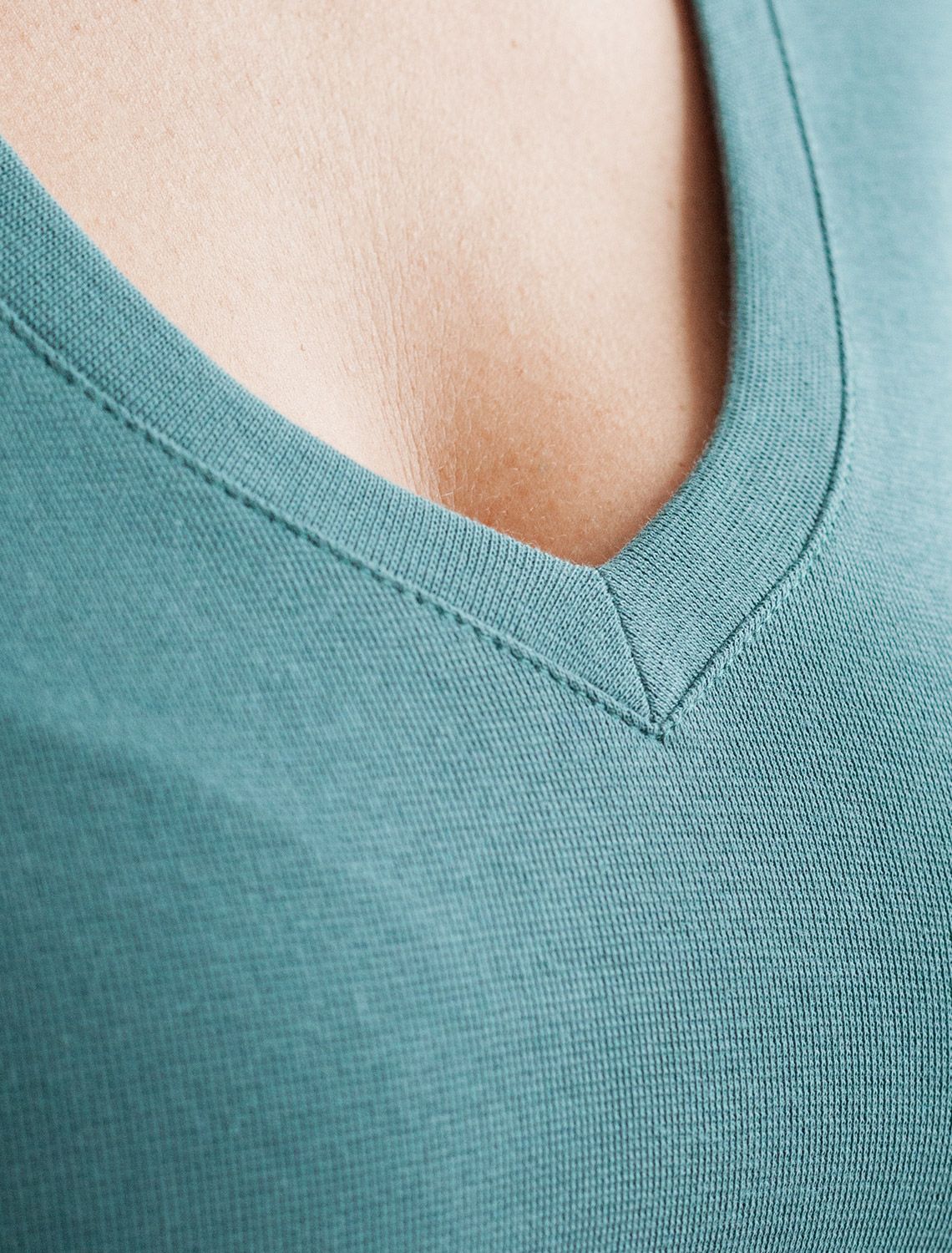 Облегающая футболка с V-образным вырезом в цвете "полынь" создаст утонченный образ. Идеальная базовая модель для вашего гардероба! Глубокий V-образный вырез подчеркивает линию шеи и зрительно удлиняет силуэт. Футболка выполнена из хлопка с добавлением эластана, которая мягко облегает контуры тела, подчеркивая достоинства фигуры. Универсальный вариант для создания стильных повседневных образов.
