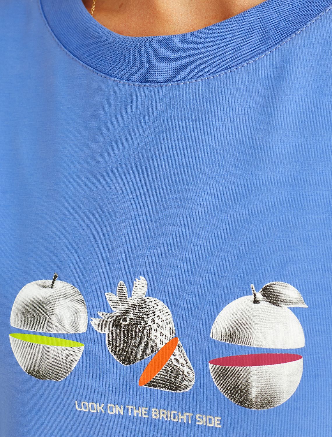 Перевод принта: Look on the bright side - смотри на жизнь позитивно. Футболка выполнена из премиального хлопка. Авторский принт нанесен фактурными красками с устойчивым покрытием. Наличие эластана в составе гарантирует комфорт и формоустойчивость. Изделие дополнено фирменным металлическим логотипом бренда.