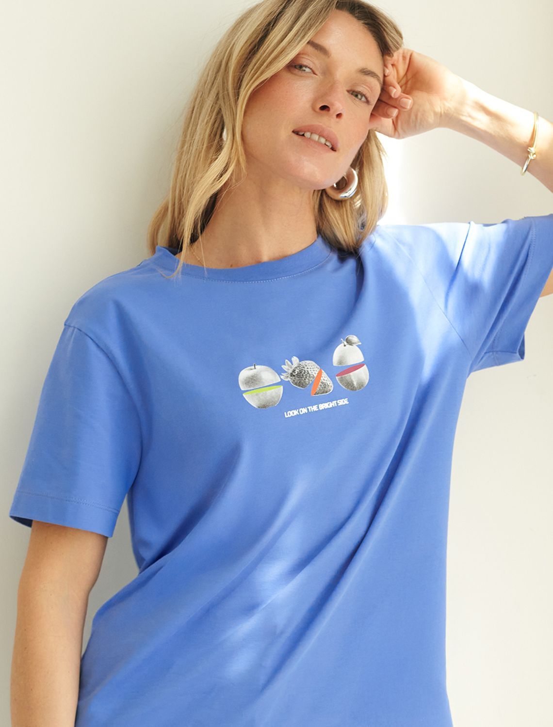 Перевод принта: Look on the bright side - смотри на жизнь позитивно. Футболка выполнена из премиального хлопка. Авторский принт нанесен фактурными красками с устойчивым покрытием. Наличие эластана в составе гарантирует комфорт и формоустойчивость. Изделие дополнено фирменным металлическим логотипом бренда.