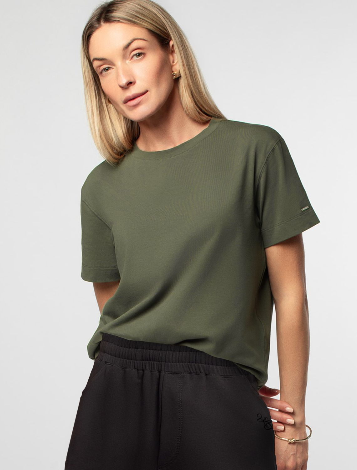 Футболка выполнена из премиального хлопка. Базовая модель, которая хорошо будет сочетаться в гардеробе с любым низом и любым дополнительным верхом вне зависимости сезона. Эластан в составе способствует формоустойчивости и меньшей сминаемости. Изделие украшено логотипом бренда.