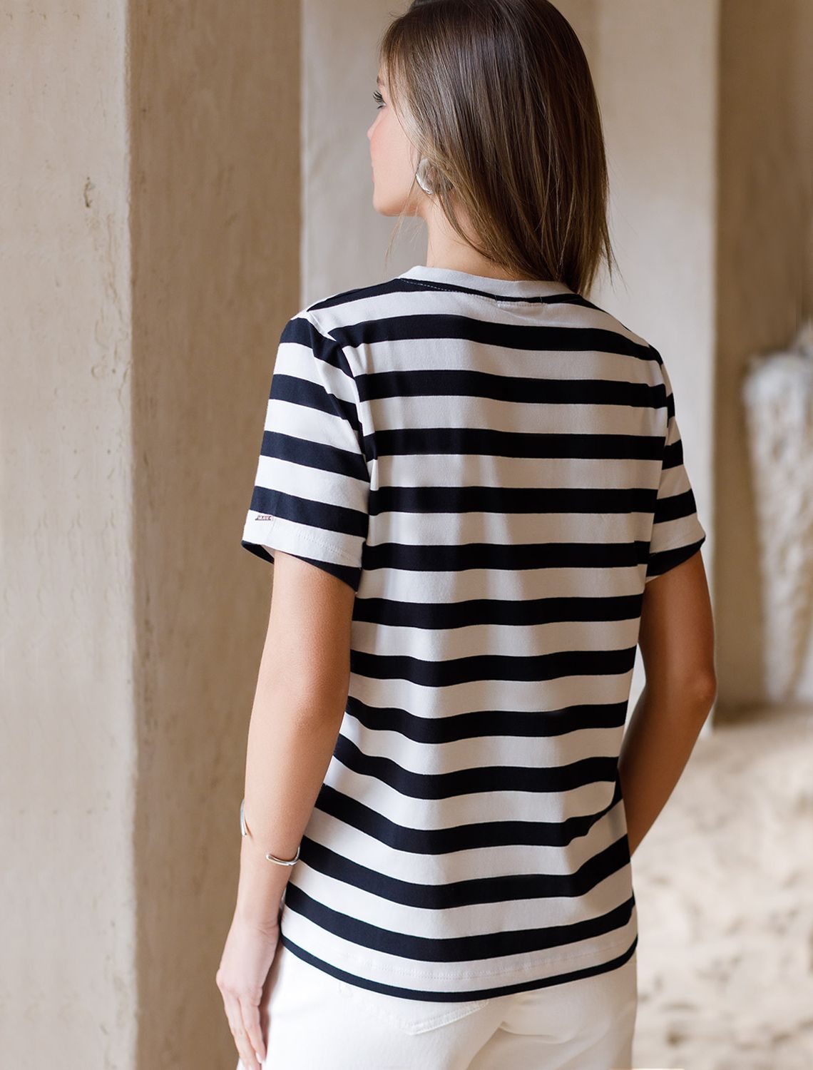 Футболка выполнена из премиального хлопка. Базовая модель с V-вырезом впишется в любой гардероб в любом сезоне. Наличие эластана в составе изделия гарантирует комфорт и формоустойчивость. На рукаве металлический логотип бренда.