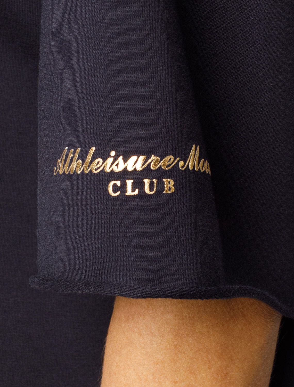 Перевод принта: Athleisure mood club - клуб любителей спортивного стиля. Футболка свободного кроя со спущенным плечом выполнена из футера двухнитки с эластаном. Лаконичный принт нанесен фактурной краской. Эластичный материал гарантирует комфорт и формоустойчивость. Сочетается в костюме с брюками D44.138, D44.139 и шортами D48.008. Изделие дополнено металлическим логотипом бренда.