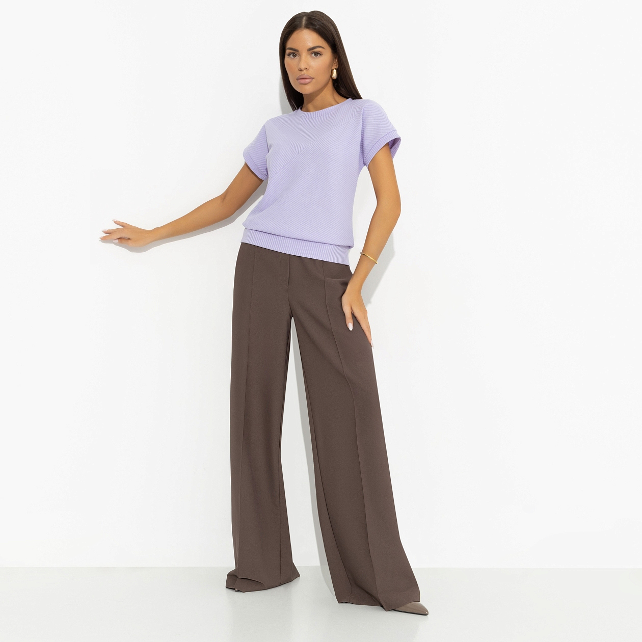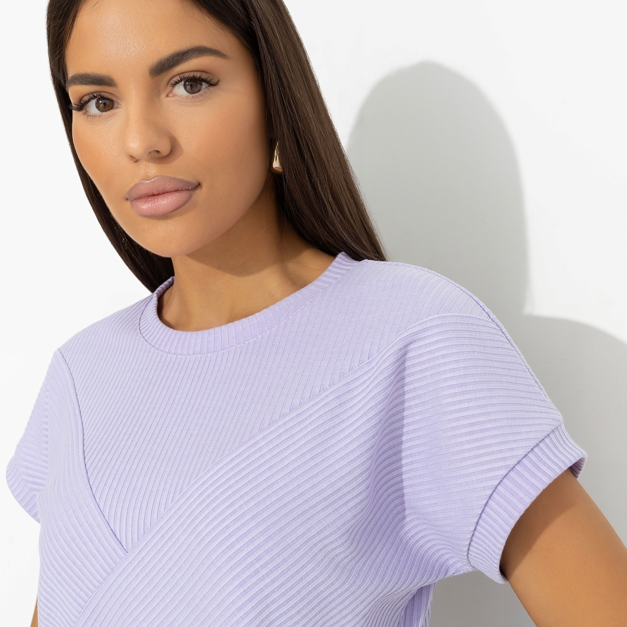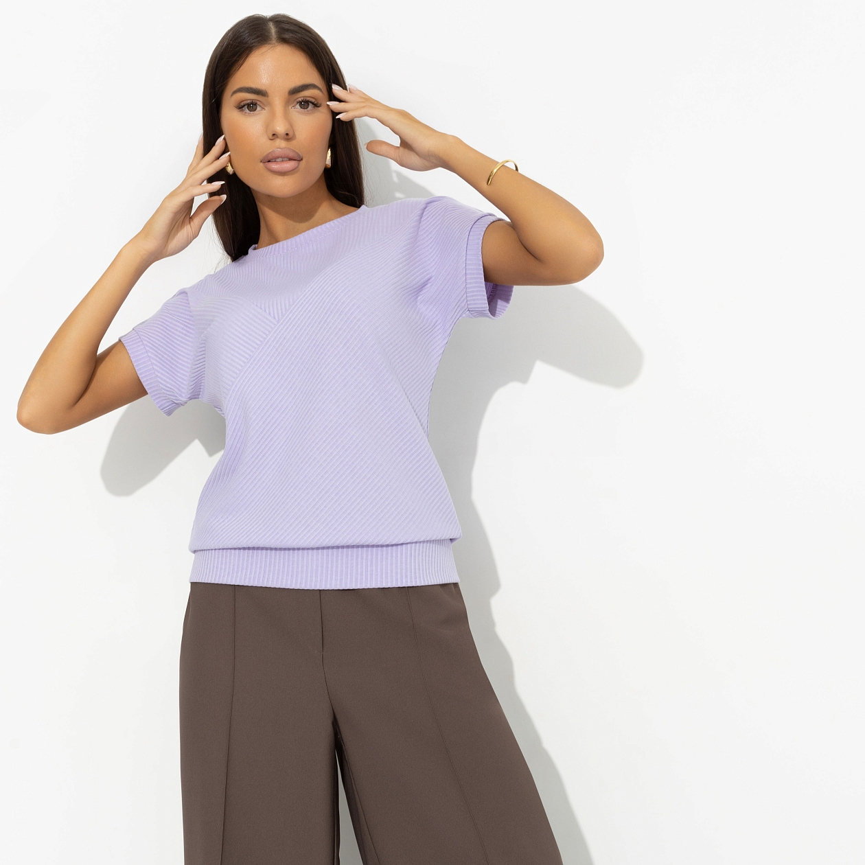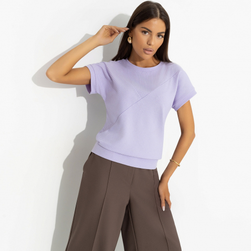 Поклонник неожиданно поздравил тебя с Днем строителя, отметив, что это твой профессиональный праздник. Увидев удивленный взгляд, добавил, что ты профессионально строишь глазки. Футболка нежного оттенка сирени усиливает твою привлекательность в его глазах. Футболка свободного силуэта. Линия плеча спущена. Материал изделия текстурный. Хорошо смотрится в заправленном виде и навыпуск.