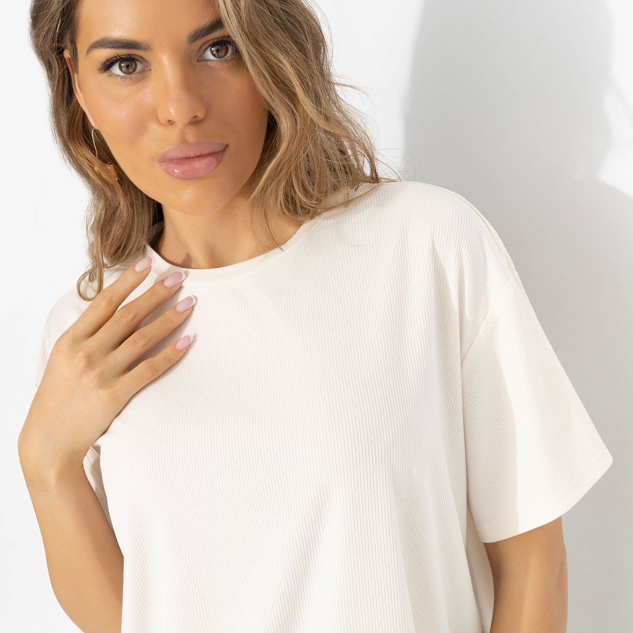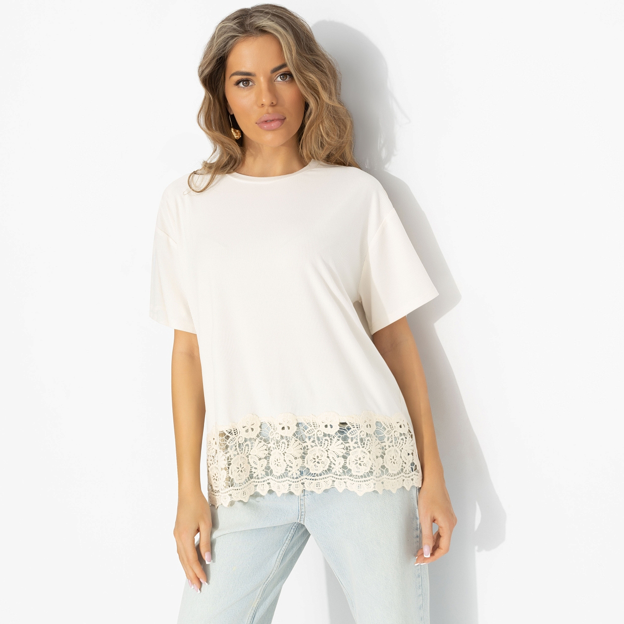 Кто сказал, что принцессы не носят футболки? Эта – про утро выходного, кофе со светлым интерьером и планы без расписания. Нежный оттенок, кружево и ощущение, что можно быть мягкой, не теряя уверенности. Это не образ «на выход», это образ «для себя». Трикотаж с вискозой приятен к телу и хорошо дышит. Кружевная отделка добавляет женственный акцент и делает футболку интереснее, чем просто база. Свободный крой позволяет сочетать её с джинсами, брюками и юбками. Подходит для повседневных и расслабленных образов.