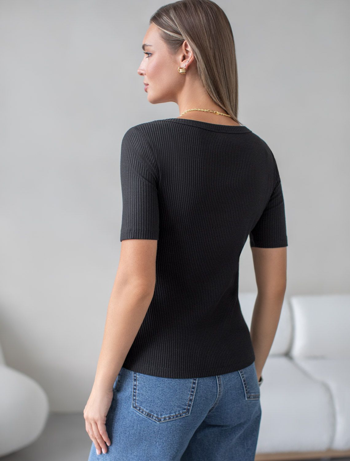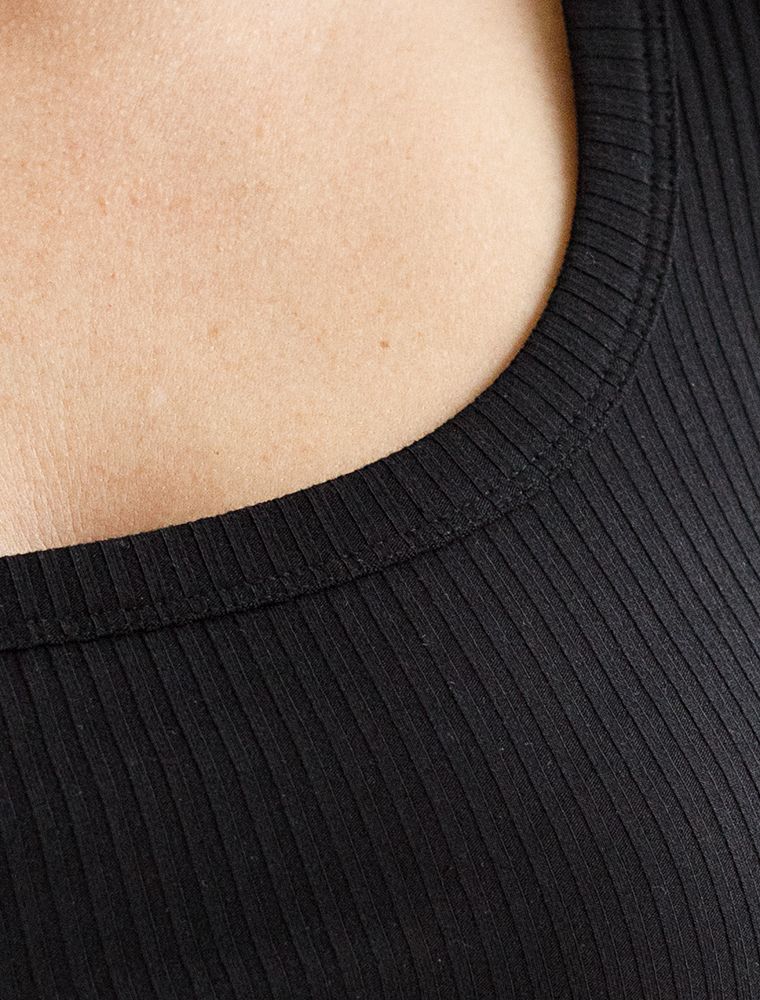 Футболка выполнена из трикотажа в широкий рубчик. Модель с круглым вырезом. Эластичный хлопковый трикотаж сидит по фигуре, не сковывает движений и очень комфортный в носке. Фактура вертикальных полос визуально стройнит и вытягивает силуэт. Базовое изделие хорошо впишется в любой гардероб. Идеально подходит для многослойных образов.