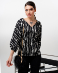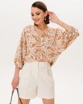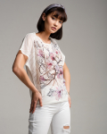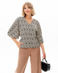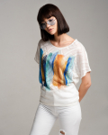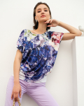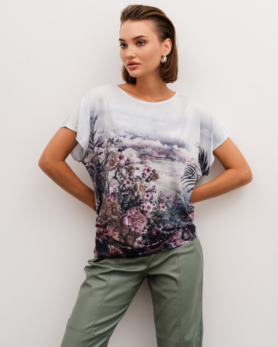 Футболка "Кимоно-баллон" из вискозной ткани "Венеция" с полной запечаткой авторским принтом. Это тонкий плотный трикотаж с матовой поверхностью, мягкий и шелковистый на ощупь, не образует катышков.  Защипы чуть ниже талии позволяют скрыть проблемные зоны фигуры. Принт наносится таким образом, что краска введена в саму текстуру ткани и надежно там закреплена. Трикотаж остается эластичным, нет никаких слоев нанесения сверху ткани. Благодаря такой технологии рисунок остается ярким даже после многочисленных стирок.