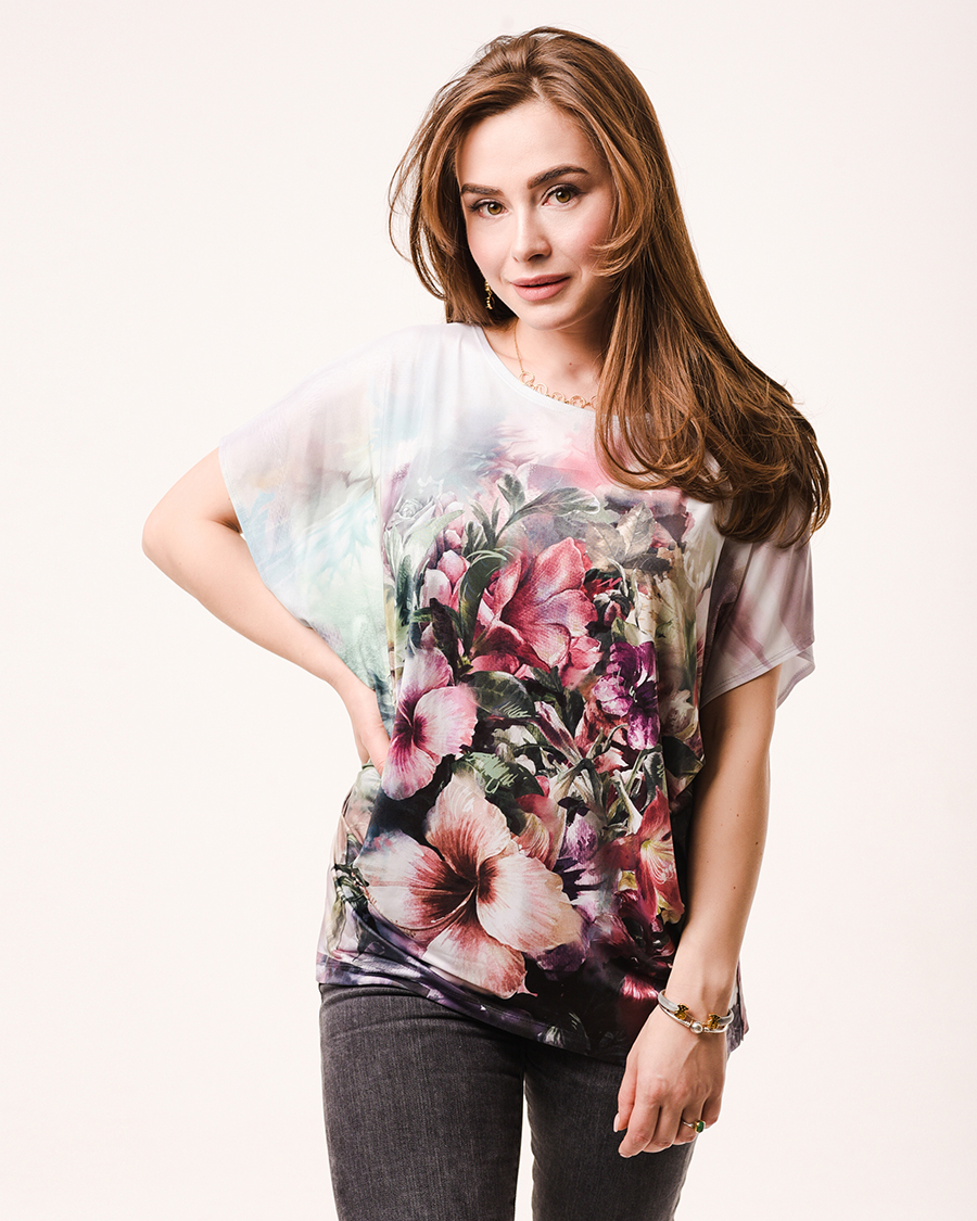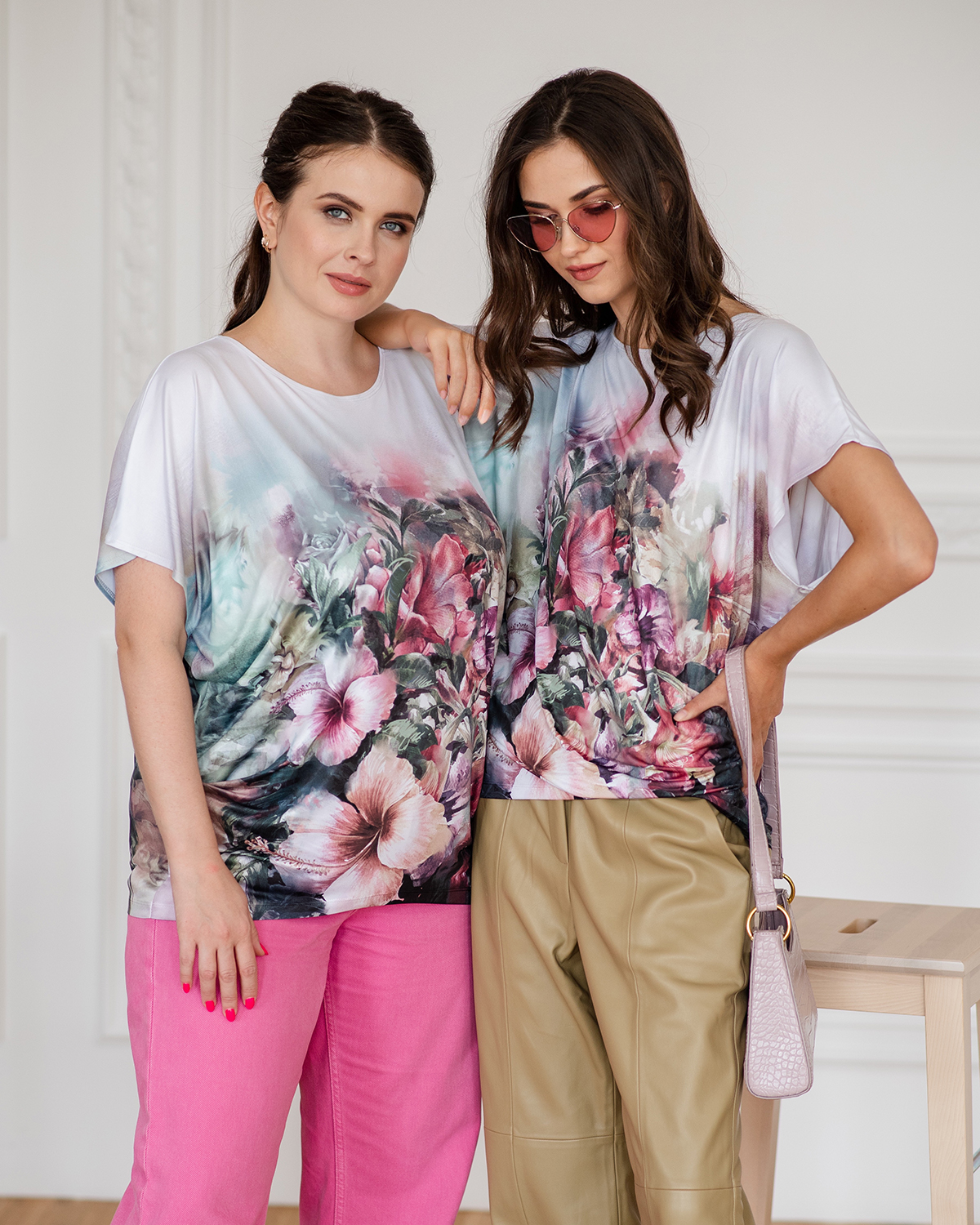 Футболка "Кимоно-баллон" из вискозной ткани "Венеция" с полной запечаткой авторским принтом. Это тонкий плотный трикотаж с матовой поверхностью, мягкий и шелковистый на ощупь, не образует катышков.  Защипы чуть ниже талии позволяют скрыть проблемные зоны фигуры. Принт наносится таким образом, что краска введена в саму текстуру ткани и надежно там закреплена. Трикотаж остается эластичным, нет никаких слоев нанесения сверху ткани. Благодаря такой технологии рисунок остается ярким даже после многочисленных стирок.