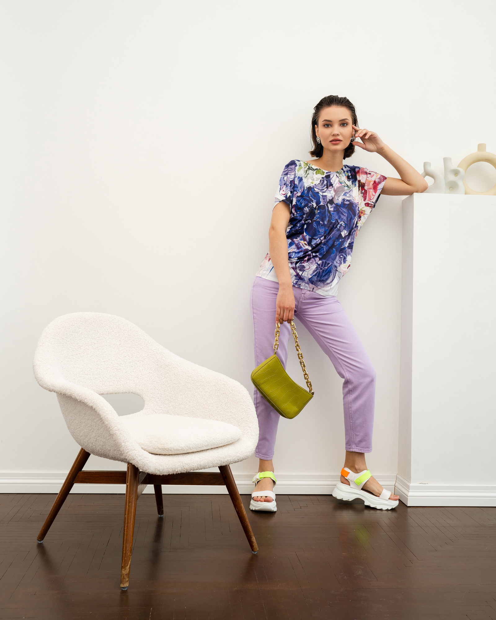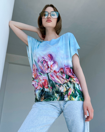 Футболка "Кимоно-баллон" из вискозной ткани "Венеция" с полной запечаткой авторским принтом. Это тонкий плотный трикотаж с матовой поверхностью, мягкий и шелковистый на ощупь, не образует катышков.  Защипы чуть ниже талии позволяют скрыть проблемные зоны фигуры. Принт наносится таким образом, что краска введена в саму текстуру ткани и надежно там закреплена. Трикотаж остается эластичным, нет никаких слоев нанесения сверху ткани. Благодаря такой технологии рисунок остается ярким даже после многочисленных стирок.