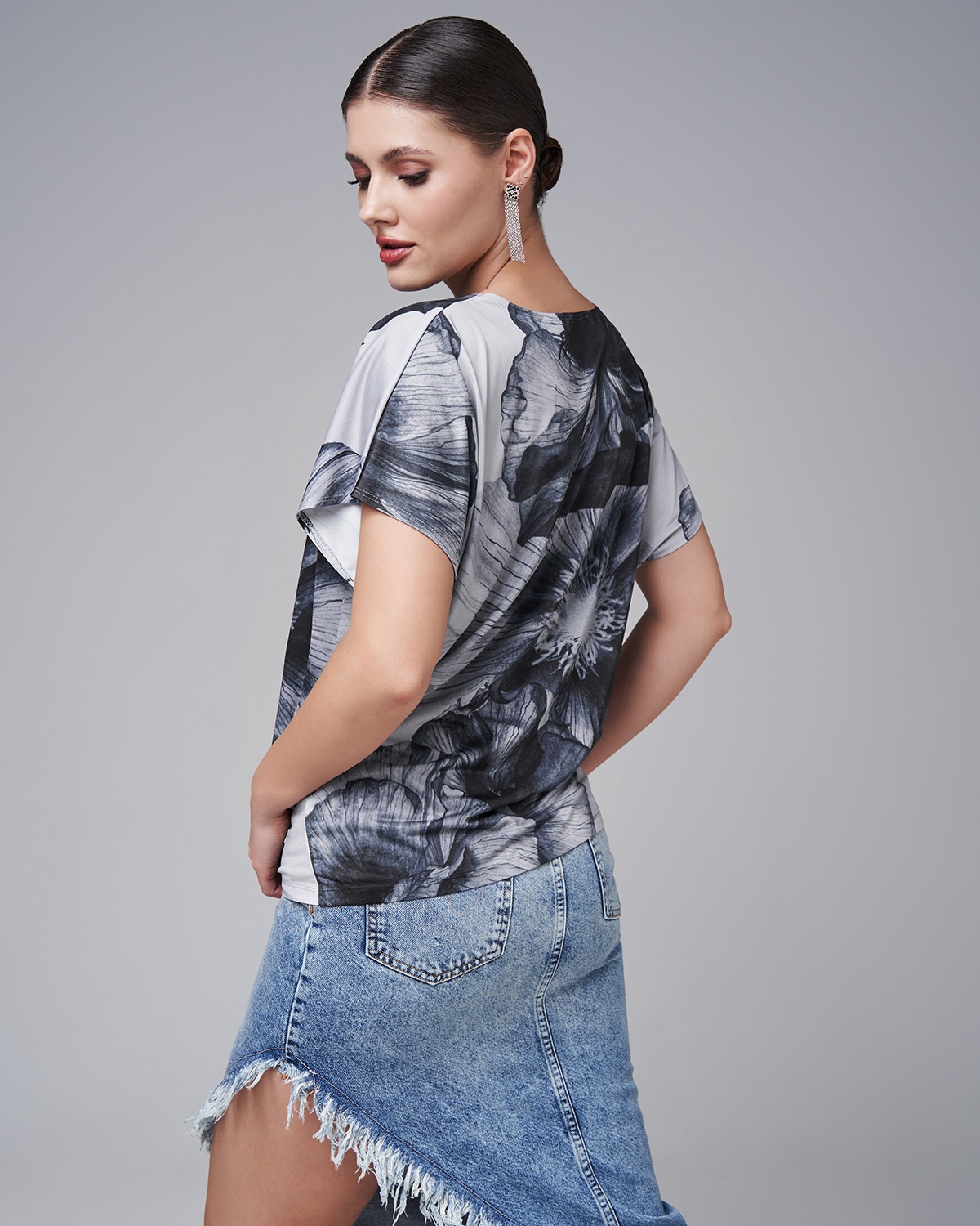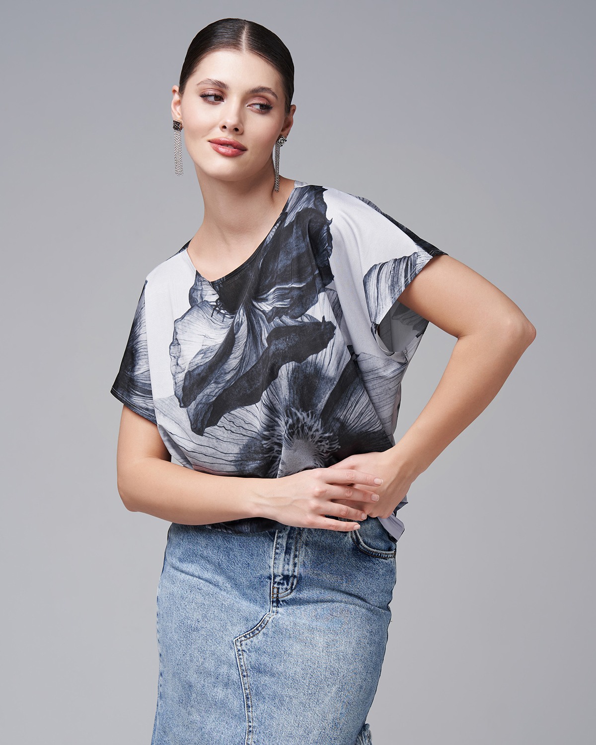 Футболка "Кимоно-баллон" из вискозной ткани "Венеция" с полной запечаткой авторским принтом. Это тонкий плотный трикотаж с матовой поверхностью, мягкий и шелковистый на ощупь, не образует катышков.  Защипы чуть ниже талии позволяют скрыть проблемные зоны фигуры. Принт наносится таким образом, что краска введена в саму текстуру ткани и надежно там закреплена. Трикотаж остается эластичным, нет никаких слоев нанесения сверху ткани. Благодаря такой технологии рисунок остается ярким даже после многочисленных стирок.