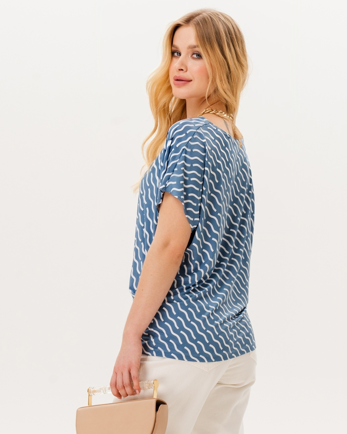 Футболка "Кимоно-баллон" из принтованной вискозной ткани "Венеция". Это тонкий плотный трикотаж с матовой поверхностью, мягкий и шелковистый на ощупь, не образует катышков.  Защипы чуть ниже талии позволяют скрыть проблемные зоны фигуры.