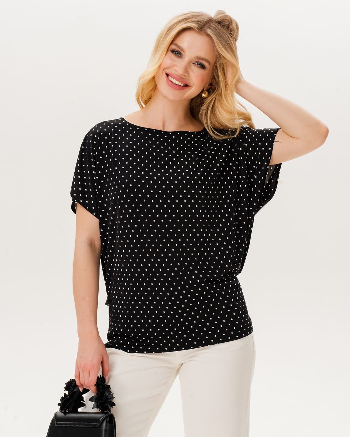 Футболка "Кимоно-баллон" из принтованной вискозной ткани "Венеция". Это тонкий плотный трикотаж с матовой поверхностью, мягкий и шелковистый на ощупь, не образует катышков.  Защипы чуть ниже талии позволяют скрыть проблемные зоны фигуры.