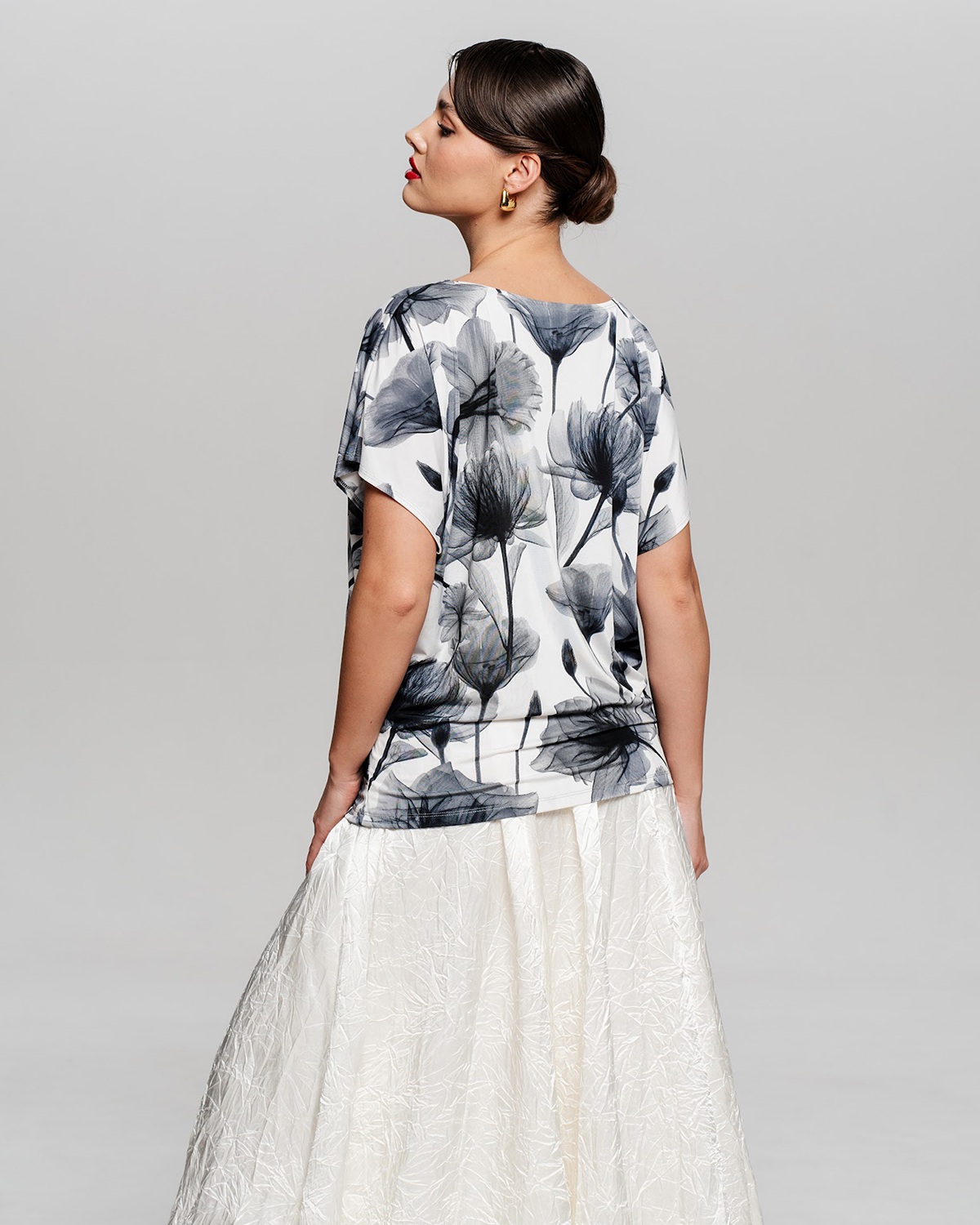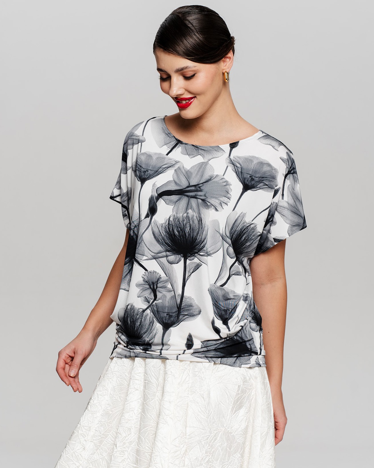 Футболка "Кимоно-баллон" из принтованной вискозной ткани "Венеция". Это тонкий плотный трикотаж с матовой поверхностью, мягкий и шелковистый на ощупь, не образует катышков.  Защипы чуть ниже талии позволяют скрыть проблемные зоны фигуры.