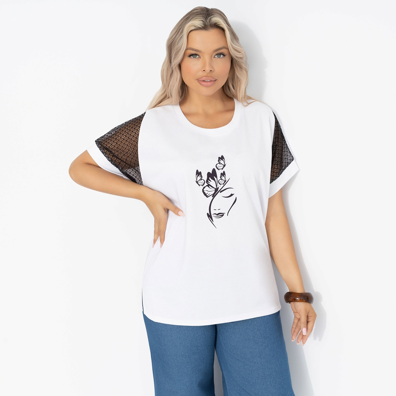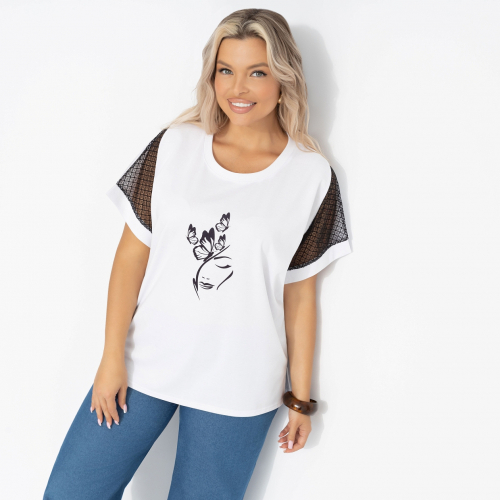 Современная супервумэн не носит плащ, она носит футболку ЧАРУТТИ. Комфортная и стильная, она подходит для ежедневных подвигов – работы, заботы о детях, ухода за домом и помощи маме. Футболка свободного кроя, комбинированная. Изделие хорошо смотрится в заправленной виде и навыпуск.