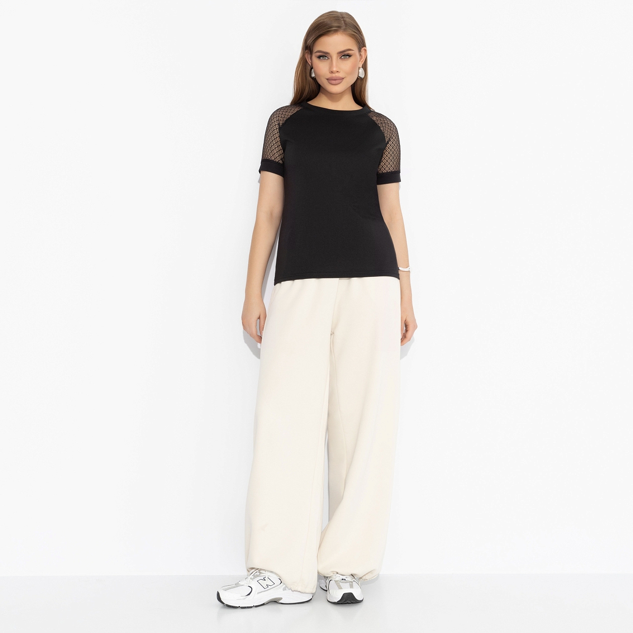 Вы с подружками решили устроить фотосет. Ты сначала хотела отказаться, но решилась. Надела футболку от ЧАРУТТИ в черном цвете с элегантным акцентом на плечи. Отгадайте, чьё фото набрало в социальных сетях больше всего лайков?! Футболка классического силуэта. Рукава оформлены тонким кружевом. Ххорошо смотрится в заправленном виде и навыпуск.