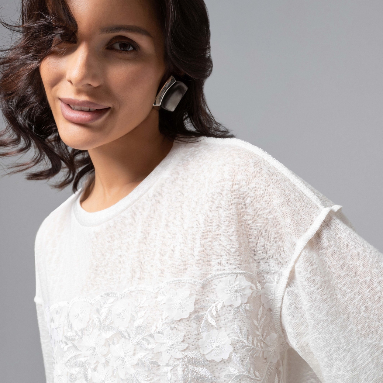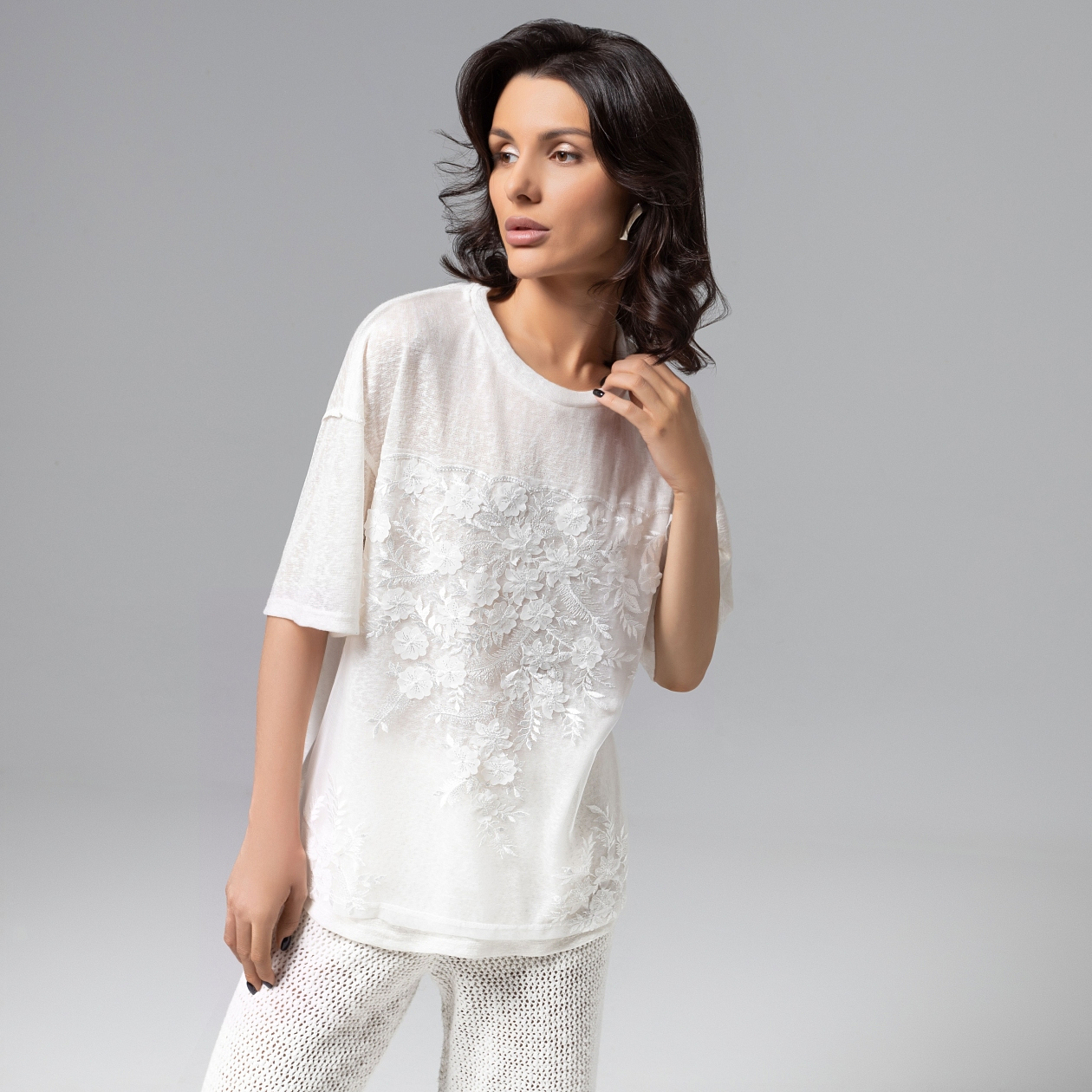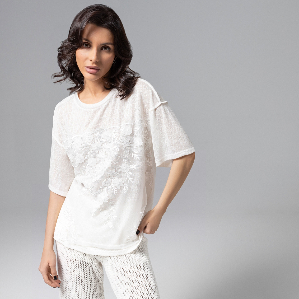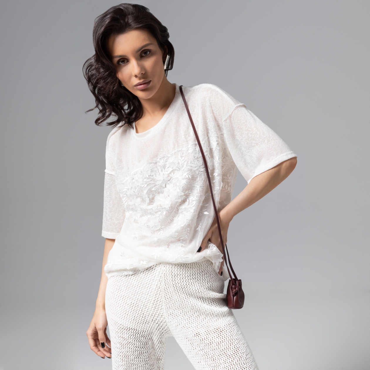 Нежность в максимальной концентрации. Футболка из мягкой вискозы в сочетании с вышивкой и объемным декором создана, чтобы сделать ваш выход из дома наполненным красотой и элегантностью. Футболка удлиненная из мягкого материала. Спущена линия плеча. Вышивка на сетке вторым слоем. Акцентные швы наружу.
