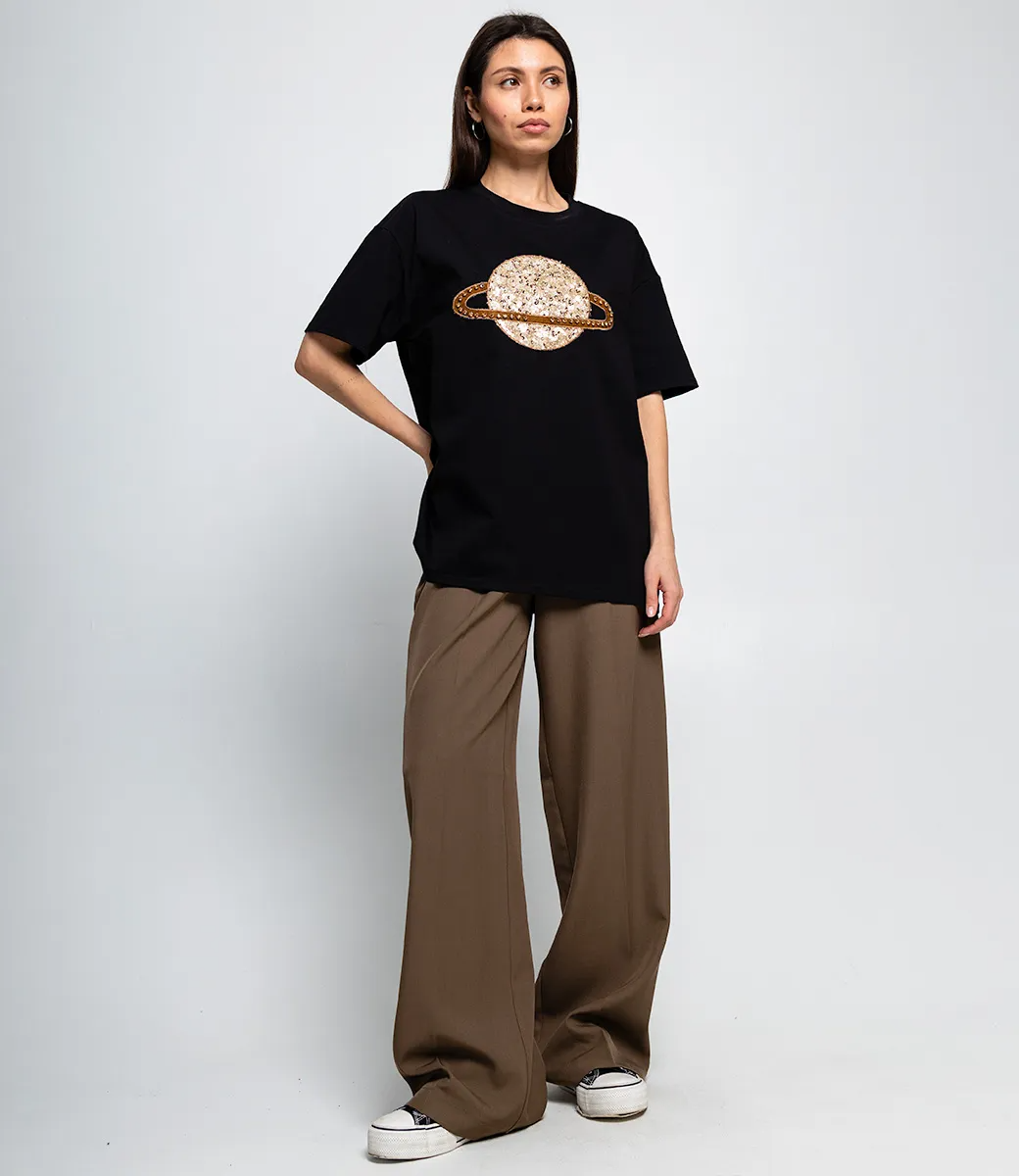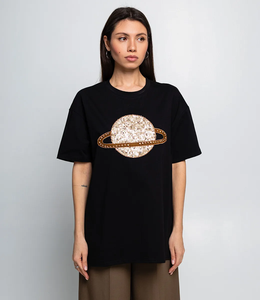 Эта футболка — прекрасный выбор для вашего магазина, предлагая стильный и универсальный дизайн, который станет отличным дополнением к гардеробу ваших клиентов. Футболка имеет свободный крой с короткими рукавами, который обеспечивает максимальный комфорт и стильный вид. На передней части футболки изображен принт в виде планеты, украшенный пайетками, что придаёт изделию оригинальности и яркости. Выполненная из 65% хлопка и 35% полиэстера, футболка обеспечивает отличное качество и приятные тактильные ощущения. Независимо от сезона, она станет любимым элементом в гардеробе ваших клиентов. На странице сайта доступна таблица размеров, что позволит вашим покупателям легко найти подходящий вариант. Установленная цена делает эту футболку доступной для широкой аудитории, что обеспечит вам высокий уровень продаж. Рост модели: 164, параметры: 83-61-89.