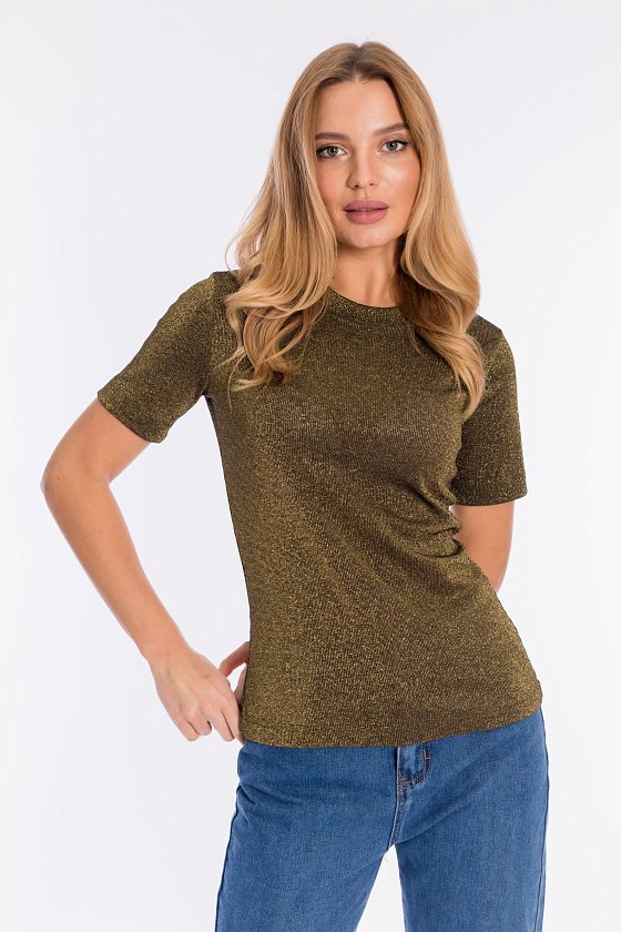 Футболка женская, облегающего силуэта, выполнена из кашкорсе с люрексом. Горловина с круглым вырезом, рукав короткий.