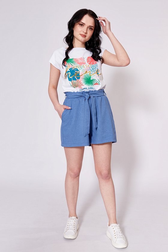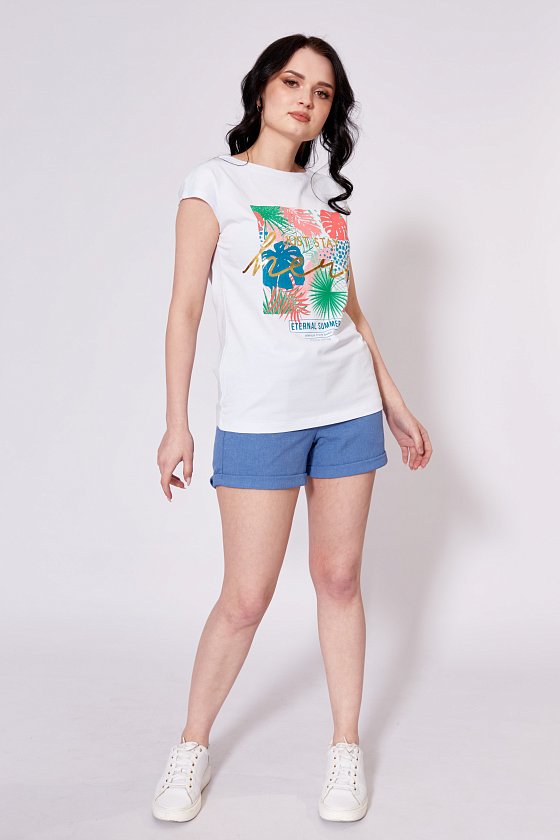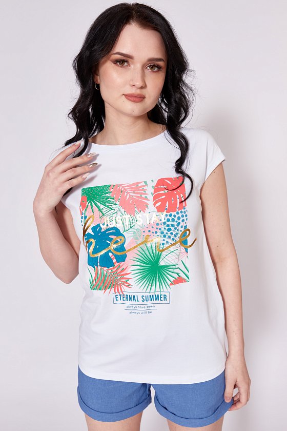 Футболка выполнена из хлопкового полотна с добавлением лайкры. Со спущенной линией плеча и горловиной лодочка. Спереди нанесён принт.