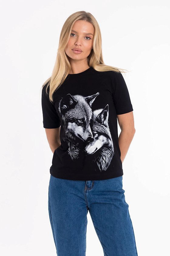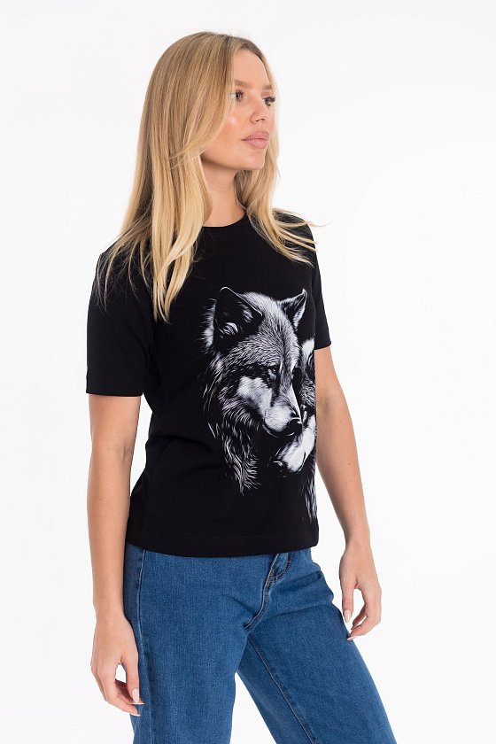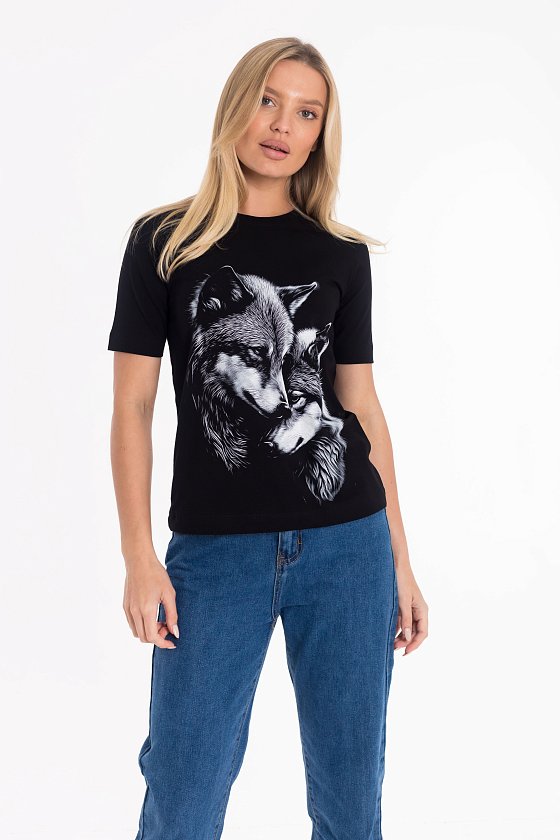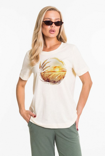 Женская футболка с принтом изготовлена из хлопкового полотна с добавлением лайкры, что обеспечивает комфорт и хорошую воздухопроницаемость. Футболка имеет короткий рукав и круглый вырез горловины, что придает ей классический стильный вид. Такая модель футболки отлично сочетается с джинсами, брюками или юбкой. Изготовленная из натуральной ткани, футболка обеспечит комфорт в течение всего дня.