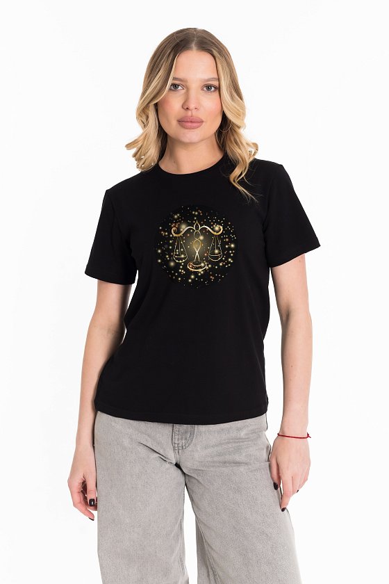 Женская футболка с принтом изготовлена из хлопкового полотна с добавлением лайкры, что обеспечивает комфорт и хорошую воздухопроницаемость. Футболка имеет короткий рукав и круглый вырез горловины, что придает ей классический стильный вид. Такая модель футболки отлично сочетается с джинсами, брюками или юбкой. Изготовленная из натуральной ткани, футболка обеспечит комфорт в течение всего дня.