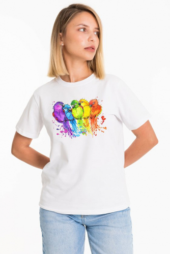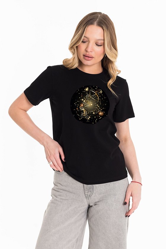 Женская футболка с принтом изготовлена из хлопкового полотна с добавлением лайкры, что обеспечивает комфорт и хорошую воздухопроницаемость. Футболка имеет короткий рукав и круглый вырез горловины, что придает ей классический стильный вид. Такая модель футболки отлично сочетается с джинсами, брюками или юбкой. Изготовленная из натуральной ткани, футболка обеспечит комфорт в течение всего дня.