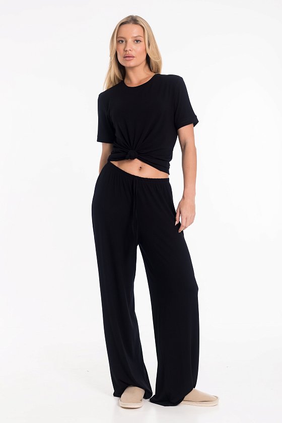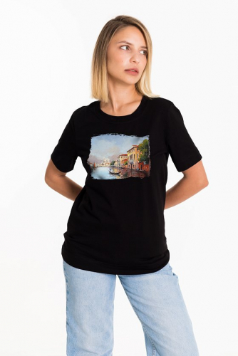 Футболка женская выполнена из вискозы чёрного цвета. Классический крой с втачным рукавом и круглым вырезом горловины делает модель универсальной и удобной для повседневной носки. Лаконичный дизайн позволяет легко сочетать футболку с другими элементами гардероба.