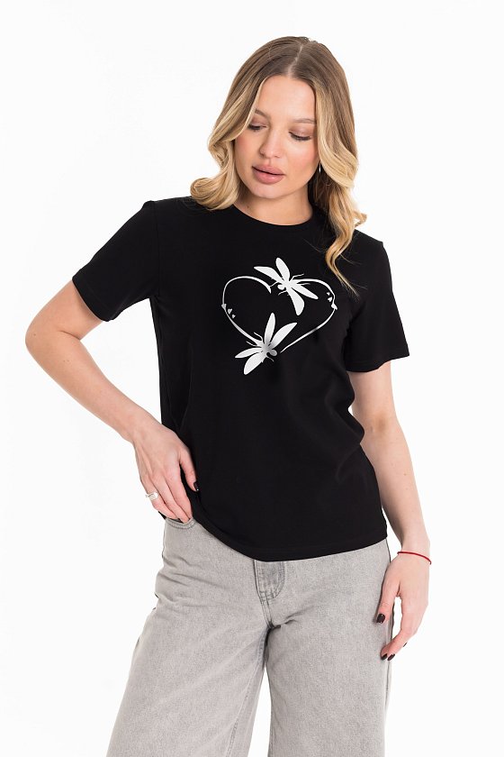 Женская футболка с принтом спереди изготовлена из хлопкового полотна с добавлением лайкры. Футболка с коротким втачным рукавом и круглым вырезом горловины, что придает ей классический стильный вид. Такая модель футболки отлично сочетается с джинсами, брюками или юбкой. Изготовленная из натуральной ткани, футболка обеспечит комфорт в течение всего дня.