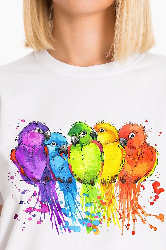 Женская футболка с принтом спереди изготовлена из хлопкового полотна с добавлением лайкры. Футболка с коротким втачным рукавом и круглым вырезом горловины, что придает ей классический стильный вид. Такая модель футболки отлично сочетается с джинсами, брюками или юбкой. Изготовленная из натуральной ткани, футболка обеспечит комфорт в течение всего дня.