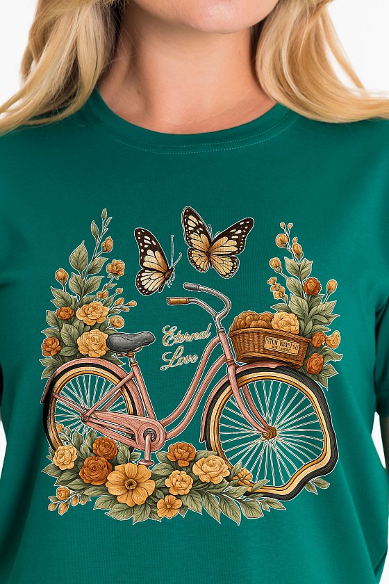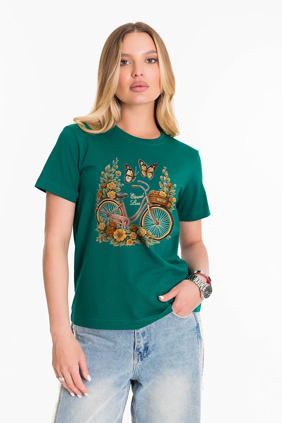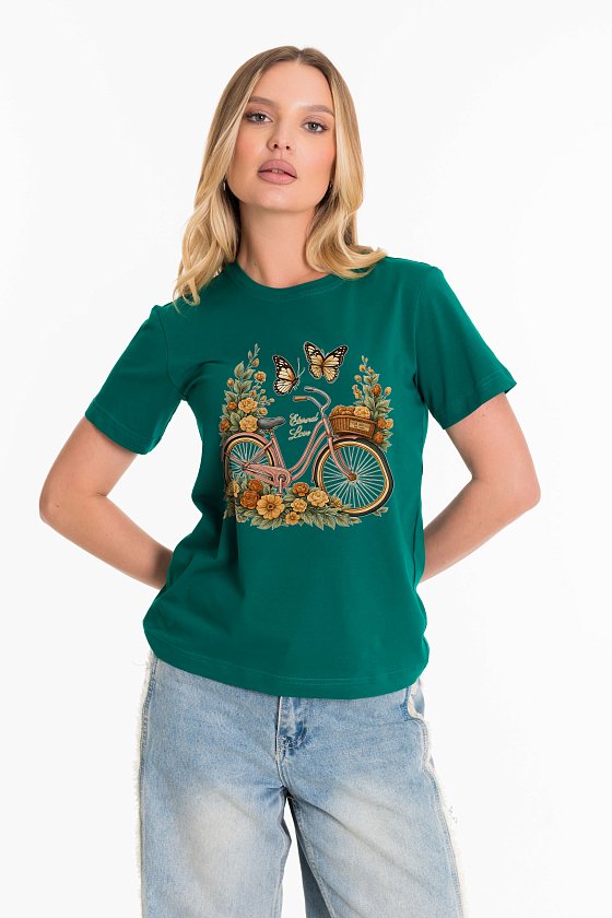 Женская футболка с принтом изготовлена из хлопкового полотна с добавлением лайкры, что обеспечивает комфорт и хорошую воздухопроницаемость. Футболка имеет короткий рукав и круглый вырез горловины, что придает ей классический стильный вид. Такая модель футболки отлично сочетается с джинсами, брюками или юбкой. Изготовленная из натуральной ткани, футболка обеспечит комфорт в течение всего дня.