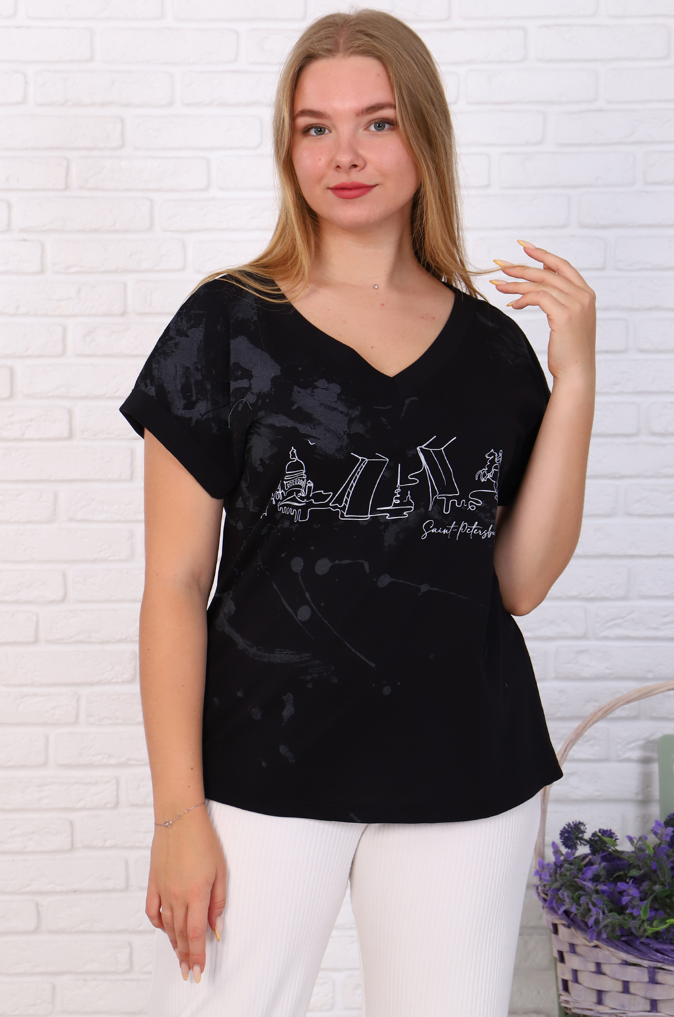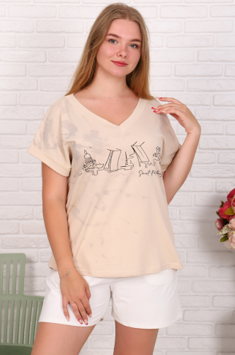Футболок много не бывает! Это незаменимая вещь в гардеробе, которая подходит к шортам, джинсам, брюкам или юбкам. Модель приталенного силуэта, рукав цельнокроенный с подворотом, стильный вырез "галочкой", на полочке печатный принт.