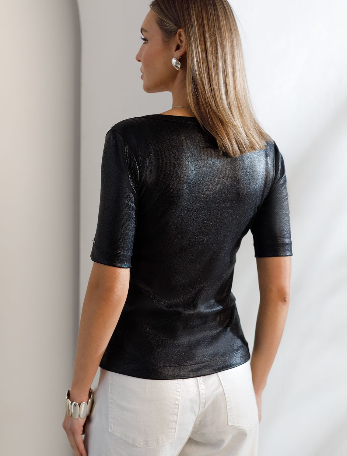 Повседневная футболка универсальна: она сочетается с джинсами, юбками или строгими брюками — легко создать как деловой образ для офиса, так и наряд для вечеринки или ужина вне дома. Матовое покрытие создает благородный блеск без лишней яркости, благодаря чему футболка смотрится свежо и актуально.