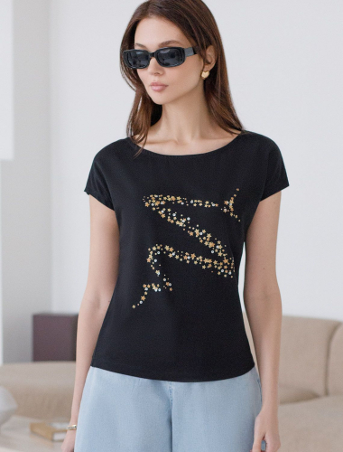 Повседневная футболка универсальна: она сочетается с джинсами, юбками или строгими брюками — легко создать как деловой образ для офиса, так и наряд для вечеринки или ужина вне дома. Матовое покрытие создает благородный блеск без лишней яркости, благодаря чему футболка смотрится свежо и актуально.