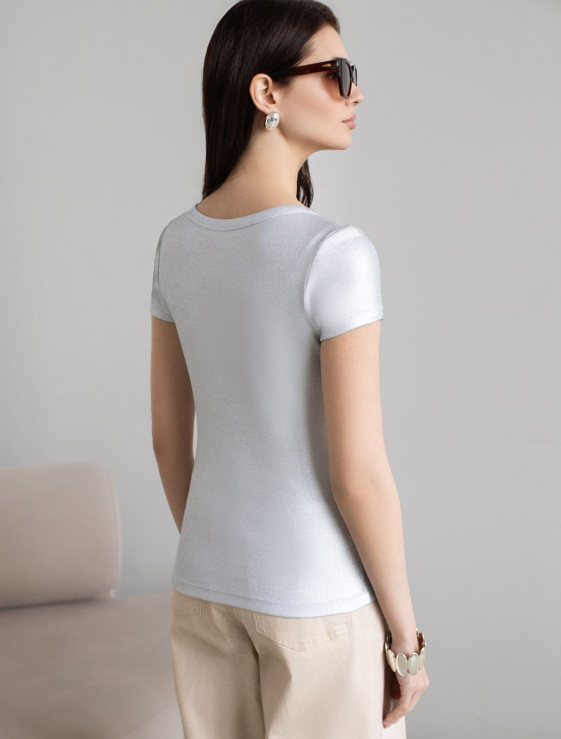 Повседневная футболка универсальна: она сочетается с джинсами, юбками или строгими брюками — легко создать как деловой образ для офиса, так и наряд для вечеринки или ужина вне дома. Матовое покрытие создает благородный блеск без лишней яркости, благодаря чему футболка смотрится свежо и актуально.