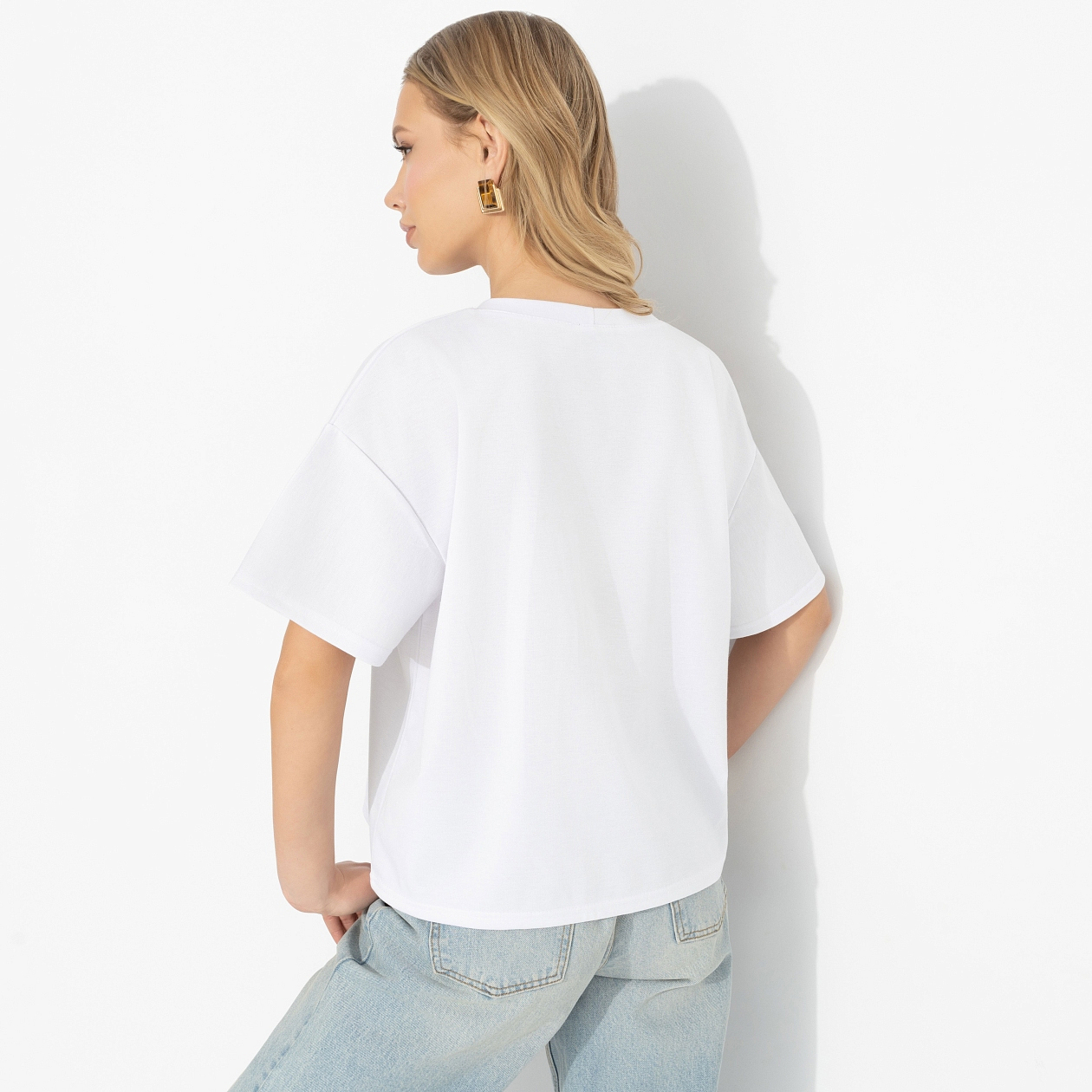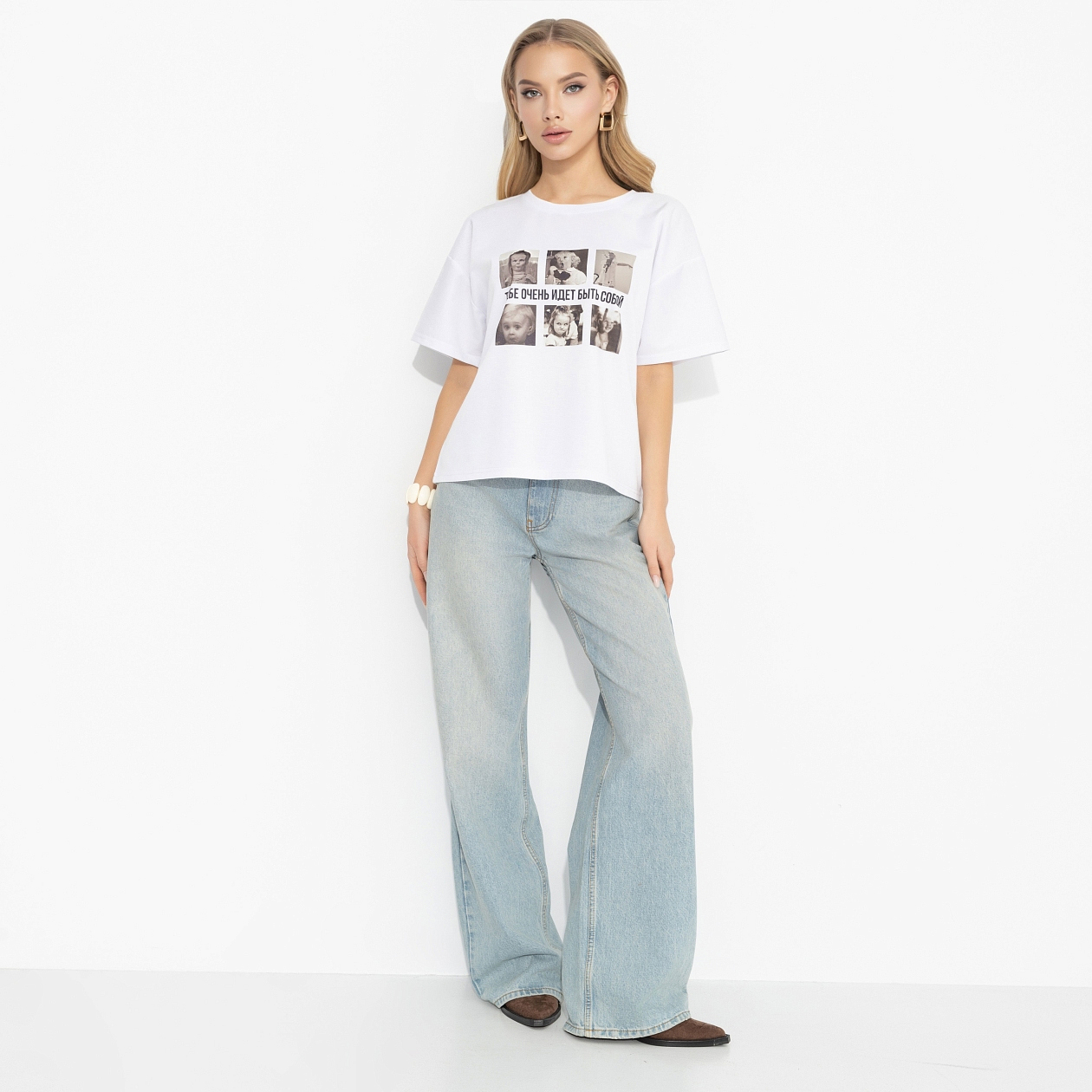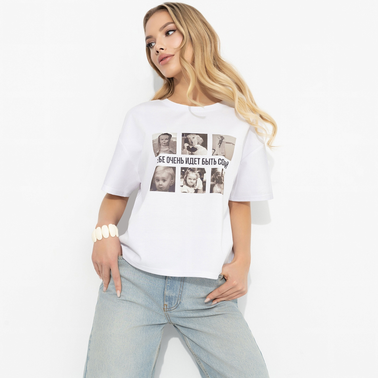 Поймала себя на мысли: иногда хочется не впечатлять, а быть самой собой. Без лишних ролей и усилий. Ты надеваешь эту футболку – и образ становится про тебя настоящую: немного расслабленную, немного задумчивую, с вайбом любимых постеров и ностальгии в духе 90-х. Трикотаж «милано» держит форму, поэтому вещь выглядит собранной, а не слишком простой. Свободный крой даёт ощущение комфорта, не теряя силуэта. Принт задаёт настроение – остаётся лишь добавить брюки или юбку и не усложнять.