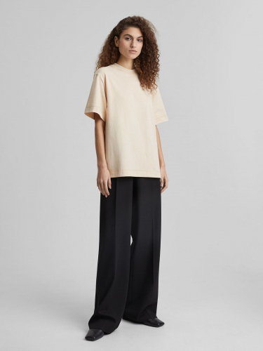 Свободный крой и спущенная линия плеча создают универсальный силуэт, позволяющий легко комбинировать футболку с различными предметами одежды. Горловина выполнена из рибаны, что обеспечивает долговечность и отличную форму, делая эту модель идеальной основой для множества образов.